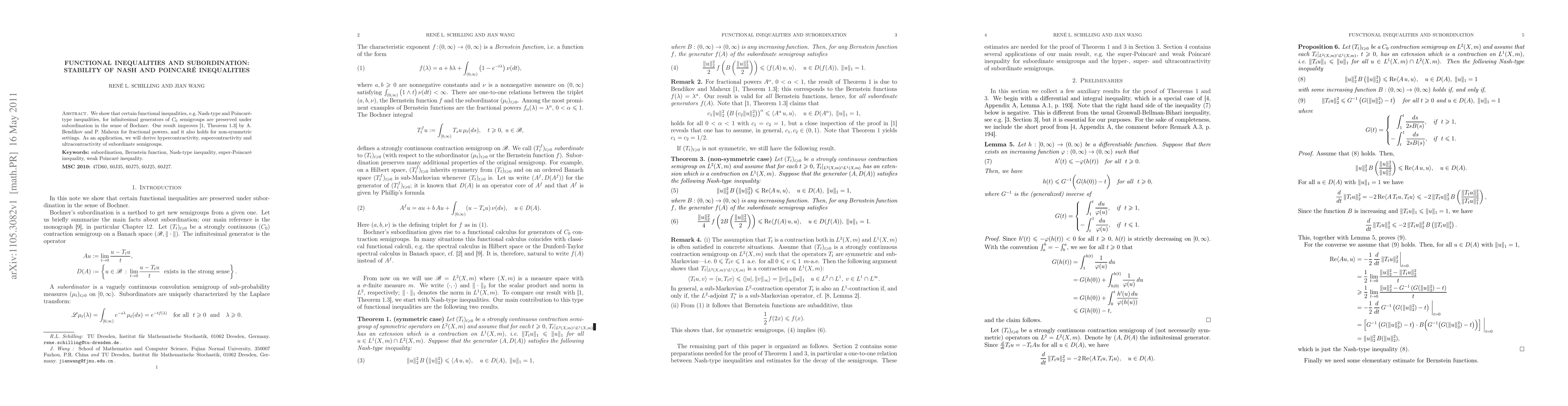 We show that certain functional inequalities, e.g.\ Nash-type and Poincar\'e-type inequalities, for infinitesimal generators of $C_0$ semigroups are preserved under subordination in the sense of Bochner. Our result improves \cite[Theorem 1.3]{BM} by A.\ Bendikov and P.\ Maheux for fractional powers, and it also holds for non-symmetric settings. As an application, we will derive hypercontractivity, supercontractivity and ultracontractivity of subordinate semigroups.