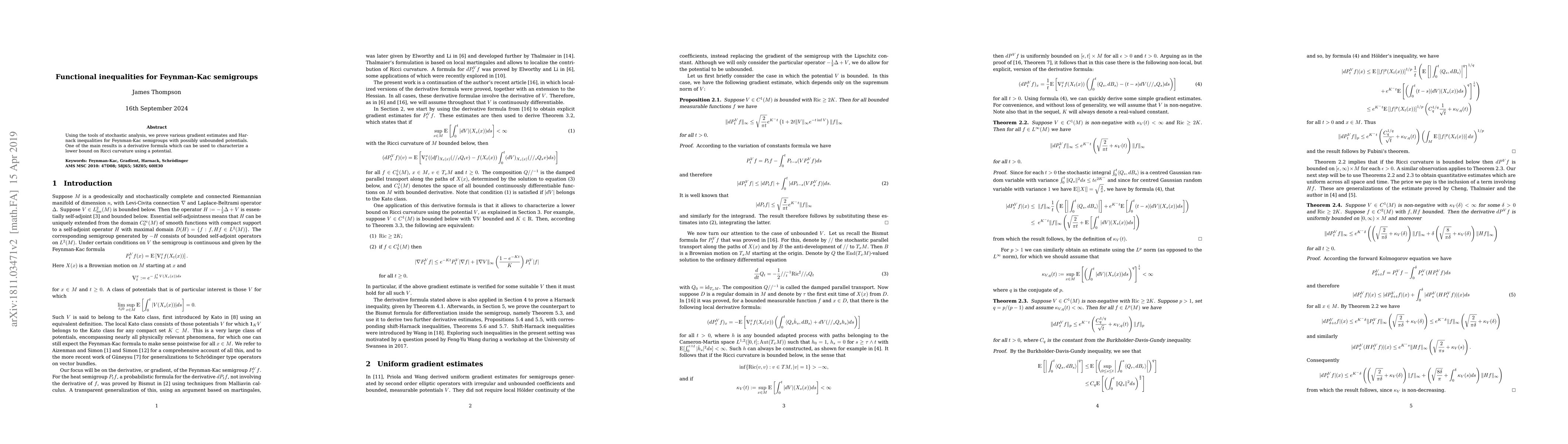 Summary: This paper leverages stochastic analysis to establish gradient estimates and Harnack inequalities for Feynman-Kac semigroups with unbounded potentials, culminating in a derivative formula to characterize lower Ricci curvature bounds via potentials.