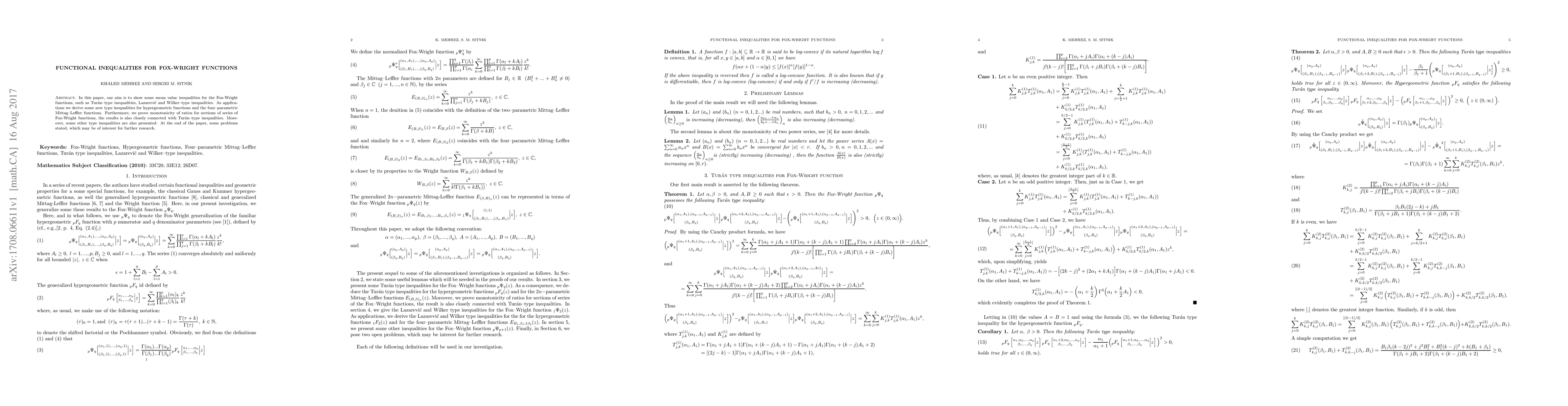 In this paper, our aim is to show some mean value inequalities for the Fox-Wright functions, such as Tur\'an--type inequalities, Lazarevi\'c and Wilker--type inequalities. As applications we derive some new type inequalities for hypergeometric functions and the four--parametric Mittag--Leffler functions. Furthermore, we prove monotonicity of ratios for sections of series of Fox-Wright functions, the results is also closely connected with Tur\'an--type inequalities. Moreover, some other type inequalities are also presented. At the end of the paper, some problems stated, which may be of interest for further research.