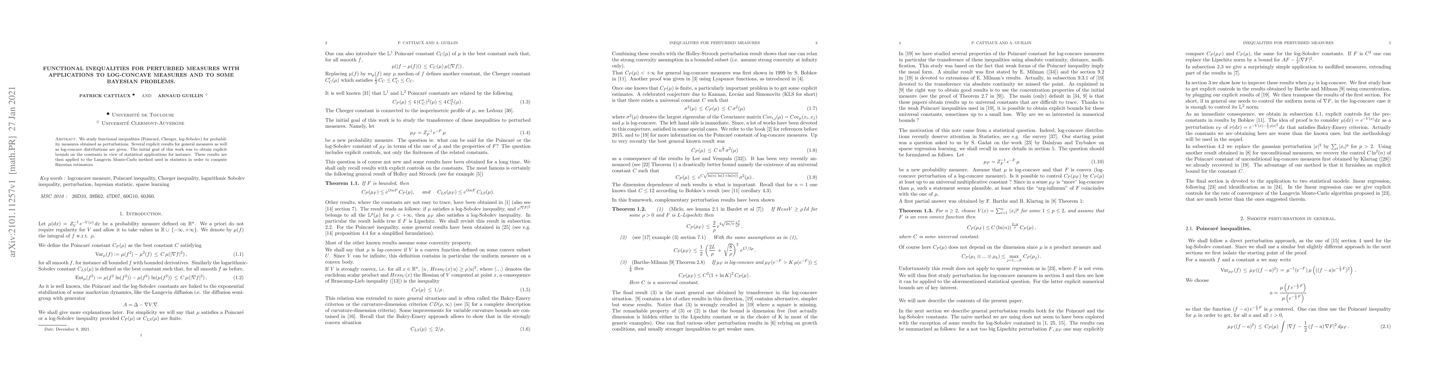 This paper investigates functional inequalities for perturbed probability measures, focusing on Poincaré, Cheeger, and log-Sobolev inequalities for both general and log-concave distributions. The findings aim to provide explicit bounds for statistical applications, particularly in the context of the Langevin Monte-Carlo method for computing Bayesian estimators.