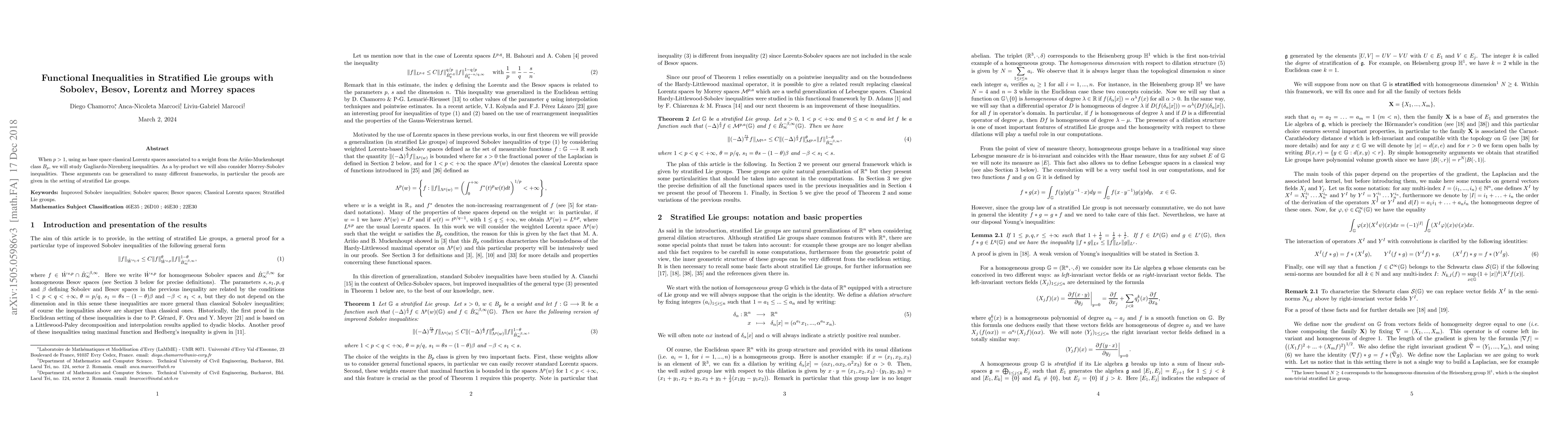 The study of Sobolev inequalities can be divided in two cases: p = 1 and 1 < p < +$\infty$. In the case p = 1 we study here a relaxed version of refined Sobolev inequalities. When p > 1, using as base space classical Lorentz spaces associated to a weight from the Arino-Muckenhoupt class Bp, we will study Gagliardo-Nirenberg inequalities. As a by-product we will also consider Morrey-Sobolev inequalities. These arguments can be generalized to many different frameworks, in particular the proofs are given in the setting of stratified Lie groups.