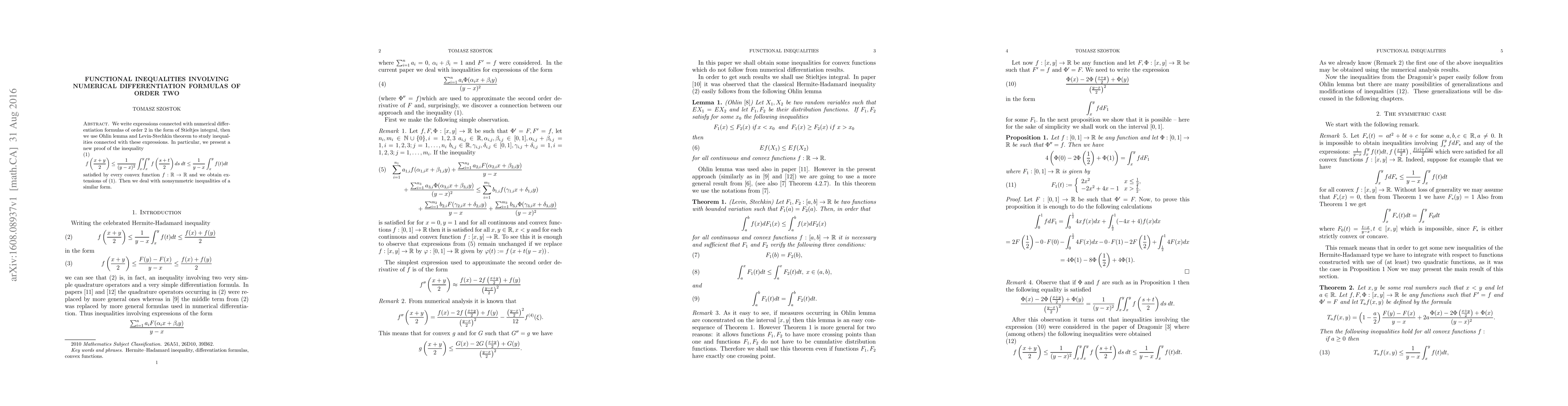 We write expressions connected with numerical differentiation formulas of order $2$ in the form of Stieltjes integral, then we use Ohlin lemma and Levin-Stechkin theorem to study inequalities connected with these expressions. In particular, we present a new proof of the inequality \begin{equation} \label{Dr} f\left(\frac{x+y}{2}\right)\leq\frac{1}{(y-x)^2}\int_x^y\hspace{-2mm}\int_x^yf\left(\frac{s+t}{2}\right)ds\:dt \leq\frac{1}{y-x}\int_x^yf(t)dt \end{equation} satisfied by every convex function $f:\R\to\R$ and we obtain extensions of \rf{Dr}. Then we deal with nonsymmetric inequalities of a similar form.