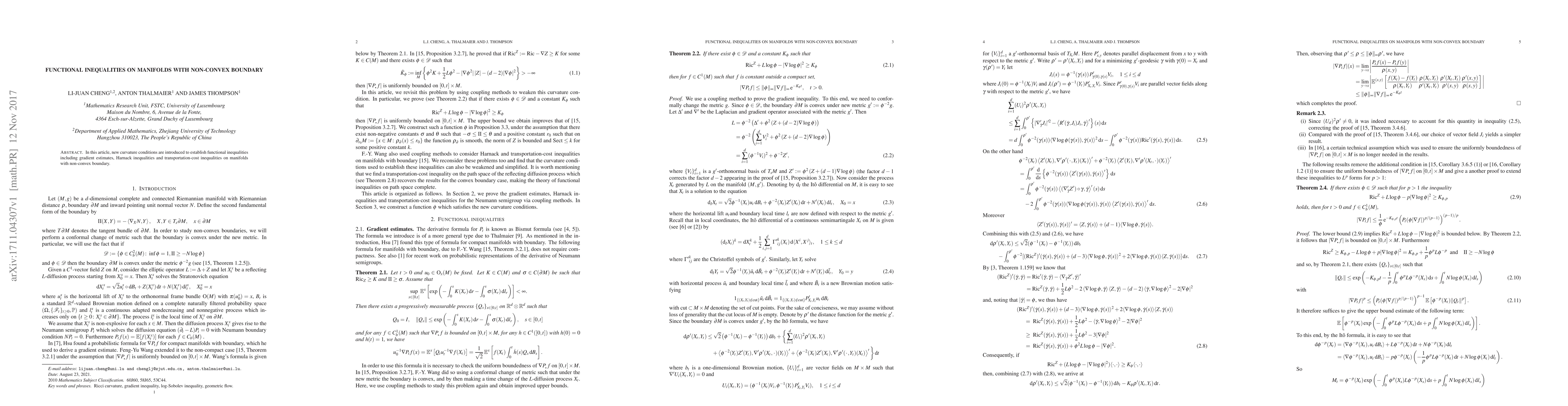 Summary: This paper introduces novel curvature conditions to establish functional inequalities, such as gradient, Harnack, and transportation-cost estimates, on manifolds with non-convex boundaries. The results extend existing inequalities to more complex geometric settings.