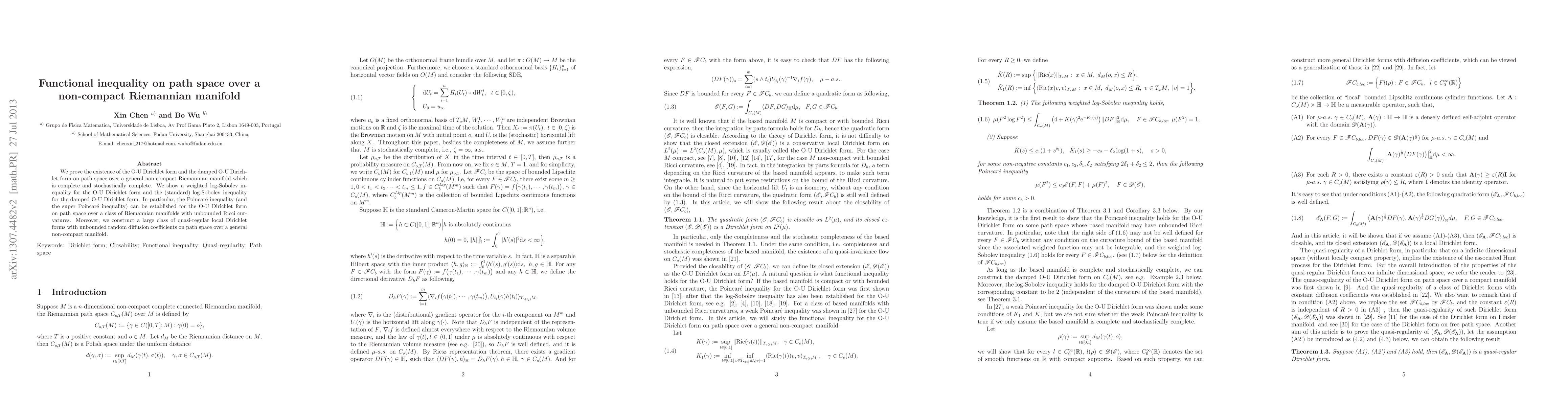 This paper establishes the existence of O-U Dirichlet forms on path space over non-compact, complete Riemannian manifolds, proving log-Sobolev inequalities and Poincaré inequalities. It also constructs quasi-regular local Dirichlet forms with random diffusion coefficients.