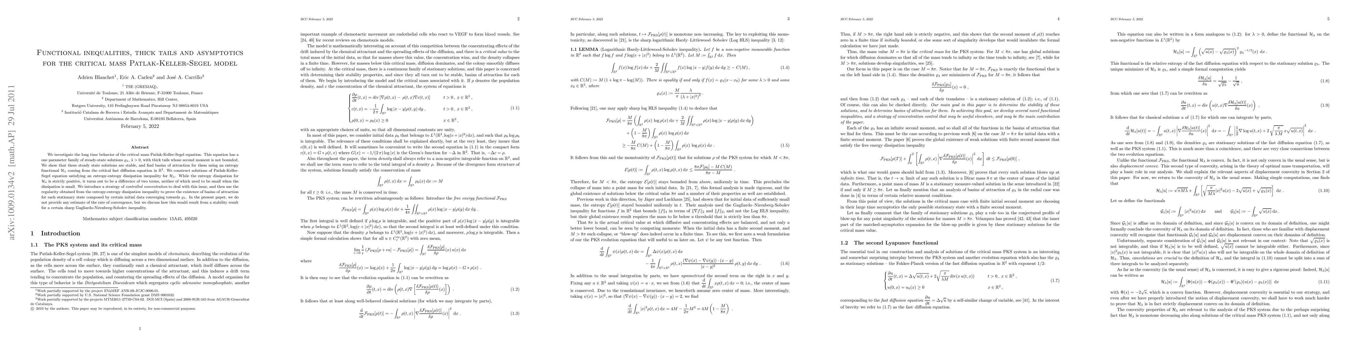 This paper studies the long-term behavior of the critical mass Patlak-Keller-Segel equation, proving the stability of its steady-state solutions with thick tails. It introduces an entropy functional to construct solutions satisfying an entropy-entropy dissipation inequality, and uses a "controlled concentration" strategy to address the non-negligible terms in the dissipation.