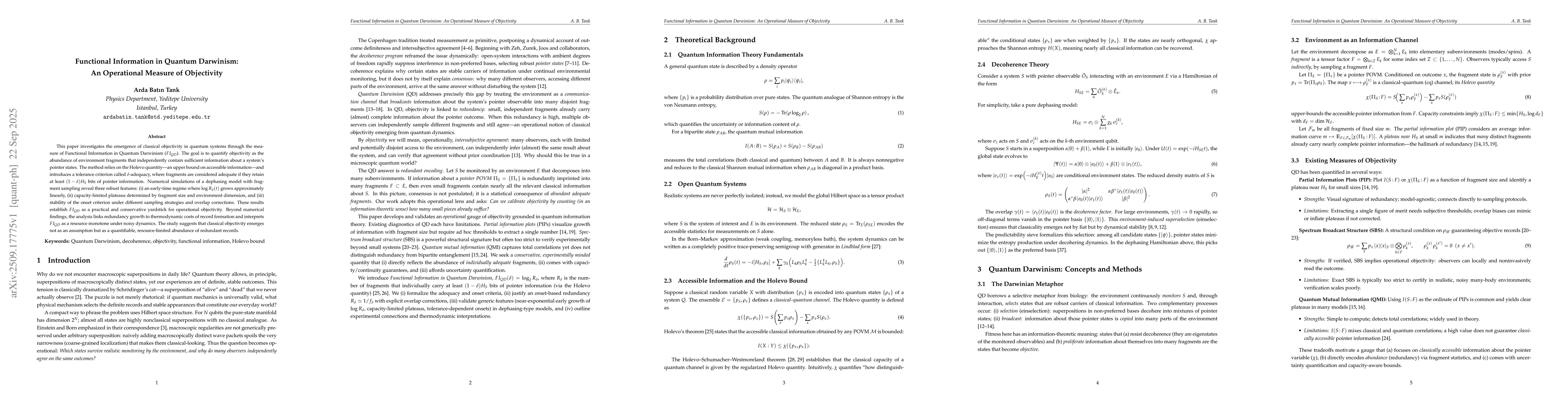 The study employs a dephasing model with fragment sampling to quantify objectivity through Functional Information in Quantum Darwinism (FIQD). It uses the Holevo quantity as an upper bound on accessible information and introduces a tolerance criterion called δ-adequacy, where fragments retain at least (1−δ)HS bits of pointer information. The analysis incorporates numerical simulations, overlap corrections, and statistical methods like Wilson score intervals and isotonic regression.