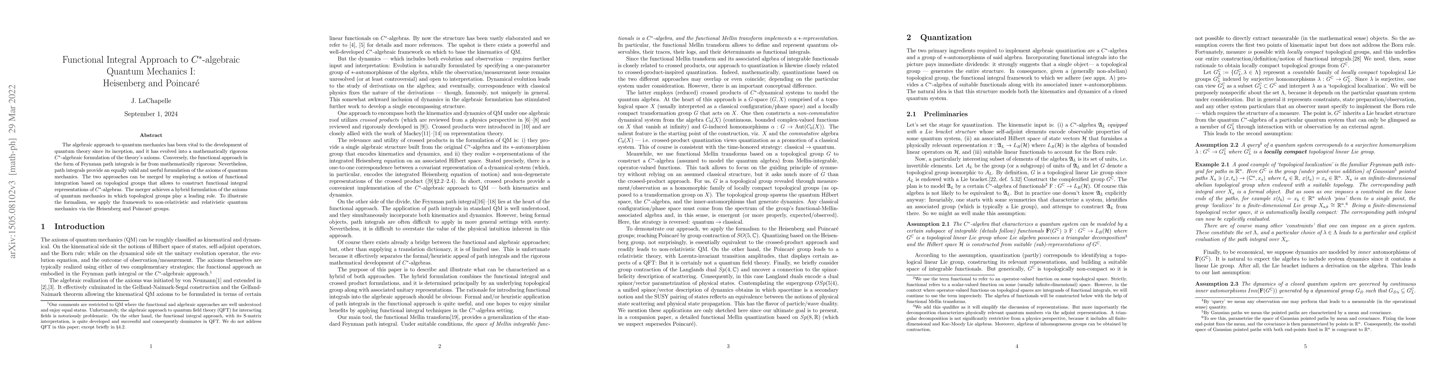 This paper merges the algebraic $C^\ast$-algebraic formulation with the functional approach of Feynman path integrals to create a hybrid framework for quantum mechanics using functional integrals based on topological groups. The framework is applied to illustrate non-relativistic and relativistic quantum mechanics through the Heisenberg and Poincaré groups.