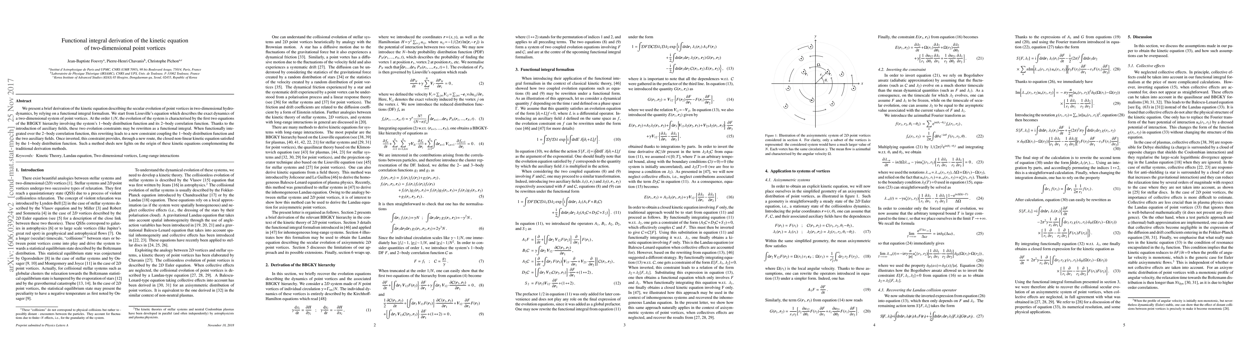 We present a brief derivation of the kinetic equation describing the secular evolution of point vortices in two-dimensional hydrodynamics, by relying on a functional integral formalism. We start from Liouville's equation which describes the exact dynamics of a two-dimensional system of point vortices. At the order ${1/N}$, the evolution of the system is characterised by the first two equations of the BBGKY hierarchy involving the system's 1-body distribution function and its 1-body correlation function. Thanks to the introduction of auxiliary fields, these two evolution constraints may be rewritten as a functional integral. When functionally integrated over the 2-body correlation function, this rewriting leads to a new constraint coupling the 1-body distribution function and the two auxiliary fields. Once inverted, this constraint provides, through a new route, the closed non-linear kinetic equation satisfied by the 1-body distribution function. Such a method sheds new lights on the origin of these kinetic equations complementing the traditional derivation methods.
