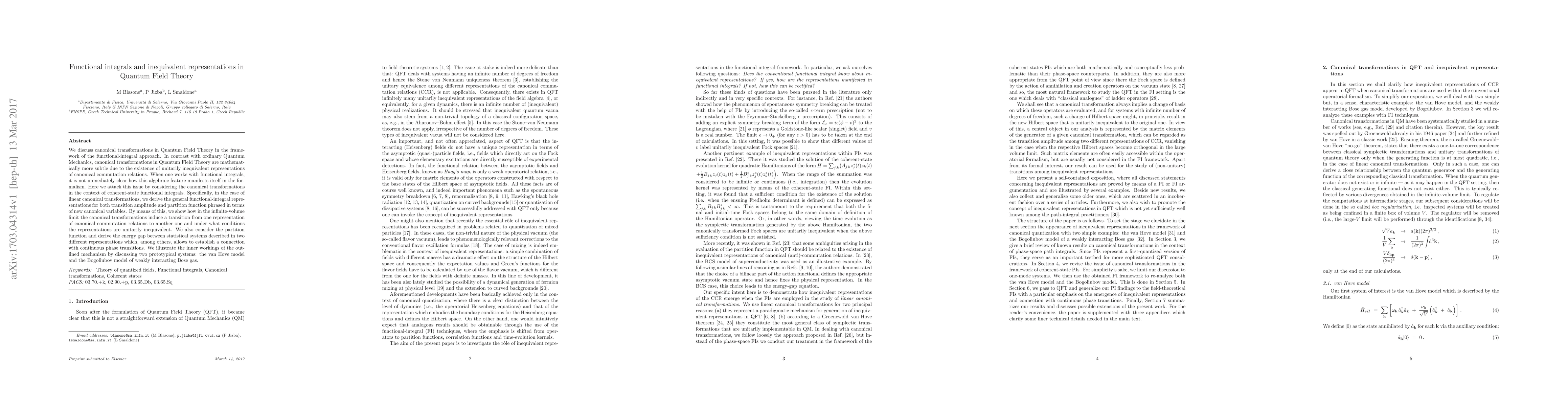 This paper explores canonical transformations in Quantum Field Theory using functional integrals, revealing how unitarily inequivalent representations of canonical commutation relations manifest. It derives functional-integral representations for transition amplitudes and partition functions, demonstrating how transformations induce transitions between different representations and establishing connections with continuous phase transitions.