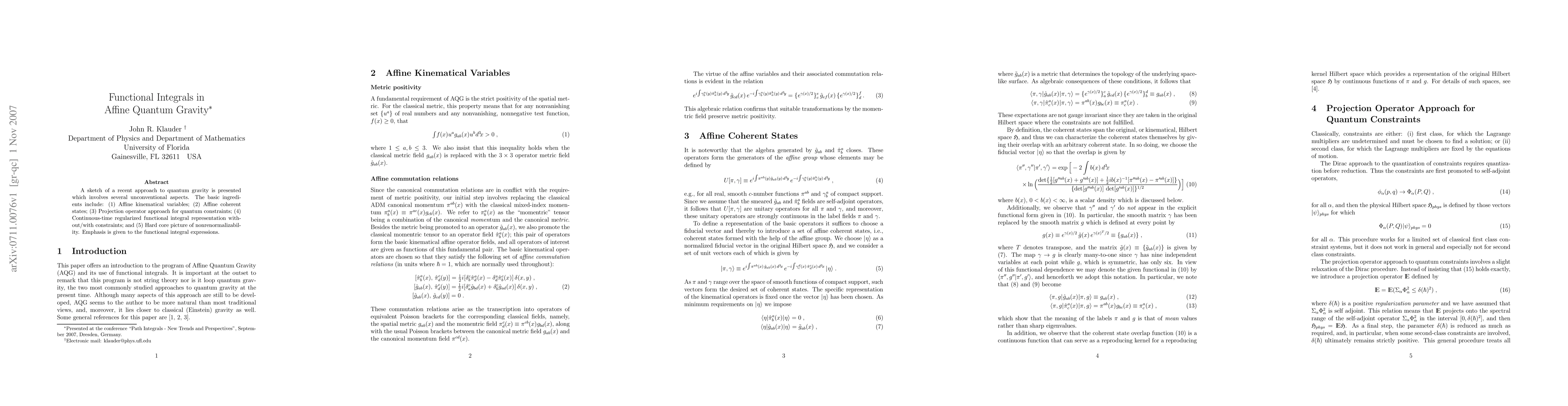 A sketch of a recent approach to quantum gravity is presented which involves several unconventional aspects. The basic ingredients include: (1) Affine kinematical variables; (2) Affine coherent states; (3) Projection operator approach for quantum constraints; (4) Continuous-time regularized functional integral representation without/with constraints; and (5) Hard core picture of nonrenormalizability. Emphasis is given to the functional integral expressions.