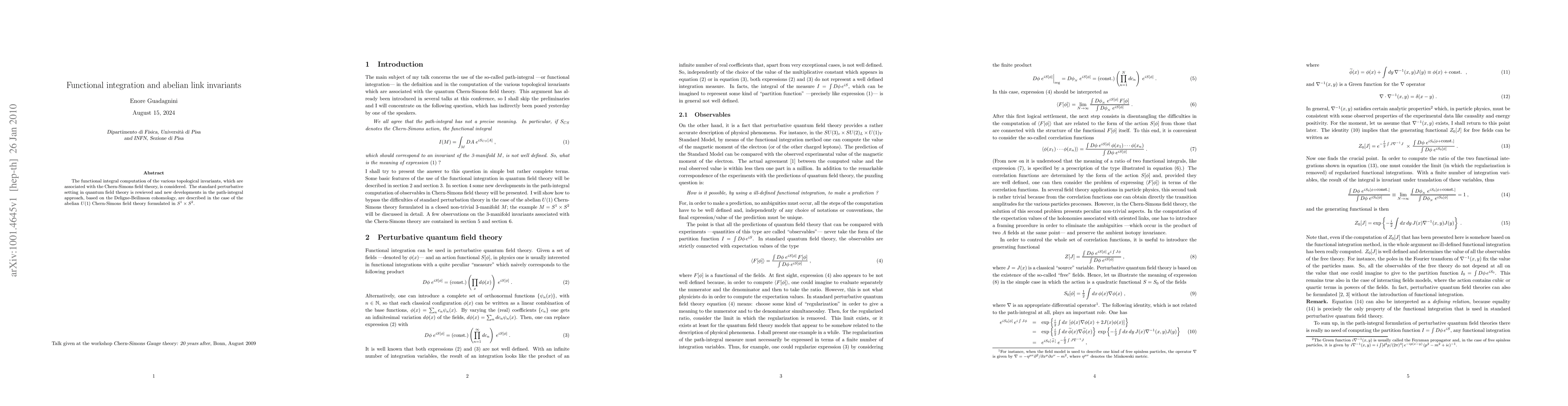 This paper explores the computation of topological invariants via functional integrals in Chern-Simons field theory, focusing on the abelian U(1) case in the context of S^1 x S^2, and introduces new developments in the path-integral approach using Deligne-Beilinson cohomology.
