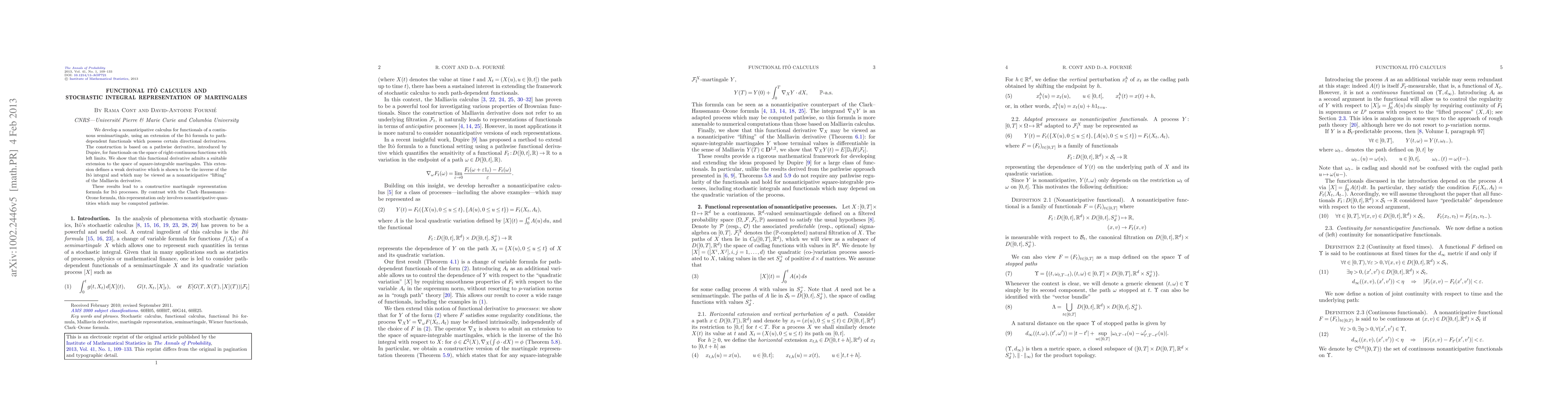 This paper develops a nonanticipative calculus for functionals of continuous semimartingales using an extended Ito formula, introducing a pathwise derivative for square-integrable martingales. This leads to a constructive martingale representation formula involving only nonanticipative quantities.