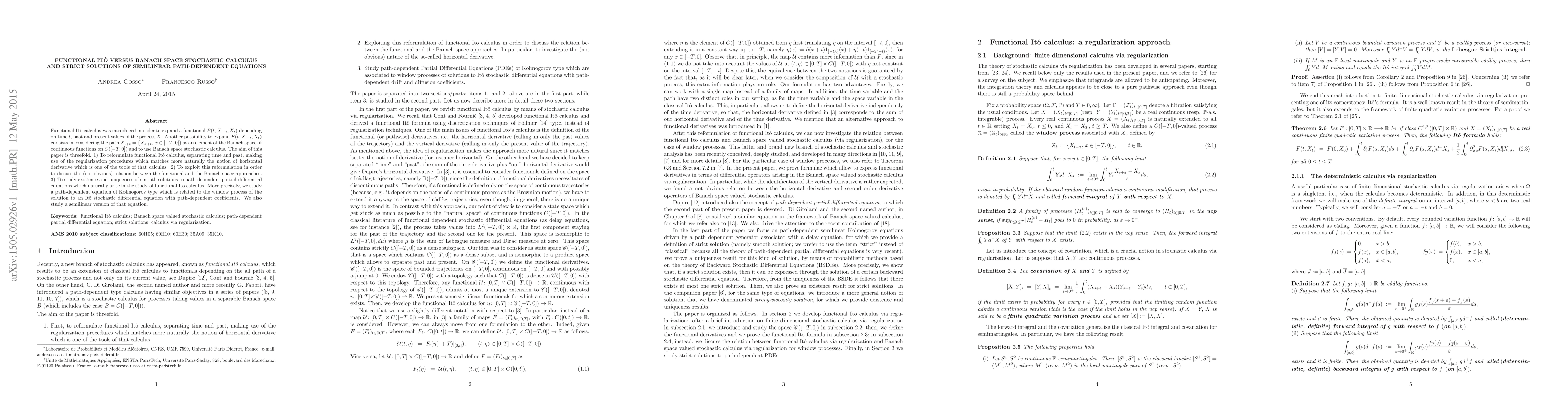 This paper reformulates functional Itô calculus to separate time and past values, utilizing regularization procedures and horizontal derivatives. It explores the relationship between functional and Banach space stochastic calculus and examines the existence and uniqueness of smooth solutions to path-dependent partial differential equations arising from functional Itô calculus, including a Kolmogorov-type equation and its semilinear variant.