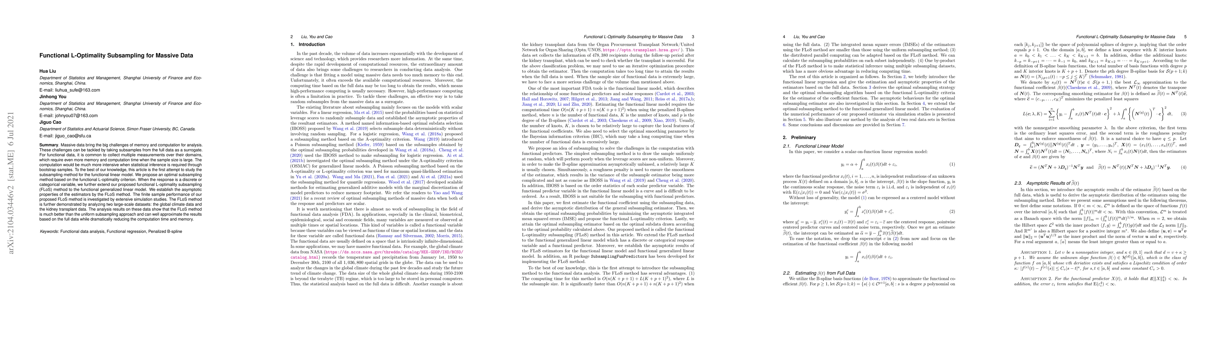 This paper proposes a functional L-optimality subsampling method (FLoS) to address the challenges of memory and computation in analyzing massive functional data. The FLoS method effectively reduces computational load while maintaining statistical inference accuracy, as demonstrated through simulations and analyses of large datasets.