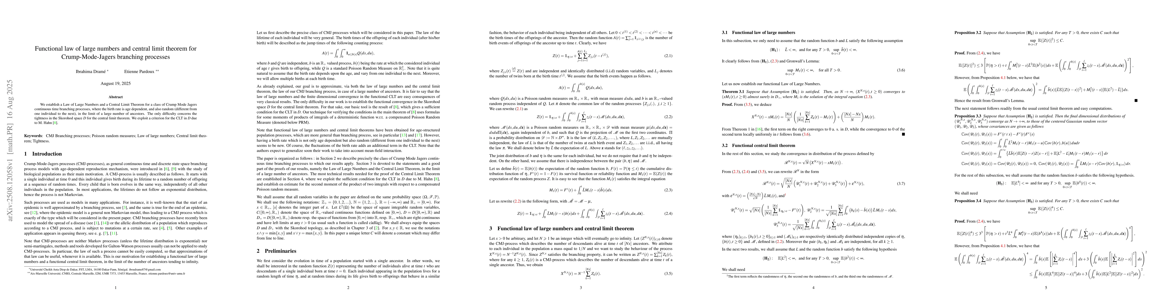 We establish a Law of Large Numbers and a Central Limit Theorem for a class of Crump Mode Jagers continuous time branching processes, where the birth rate is age dependent, and also random (different from one individual to the next), in the limit of a large number of ancestors. The only difficulty concerns the tightness in the Skorohod space $D$ for the central limit theorem. We exploit a criterion for the CLT in $D$ due to M. Hahn \cite{MH}.