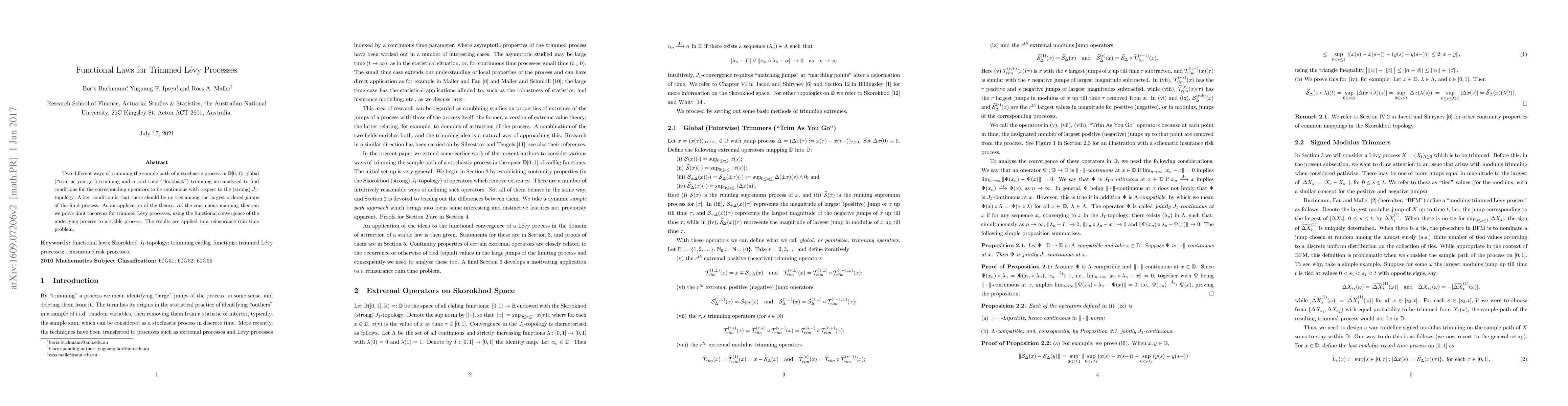 Two different ways of trimming the sample path of a stochastic process in D[0, 1]: global ("trim as you go") trimming and record time ("lookback") trimming are analysed to find conditions for the corresponding operators to be continuous with respect to the (strong) J1-topology. A key condition is that there should be no ties among the largest ordered jumps of the limit process. As an application of the theory, via the continuous mapping theorem we prove limit theorems for trimmed Levy processes, using the functional convergence of the underlying process to a stable process. The results are applied to a reinsurance ruin time problem.