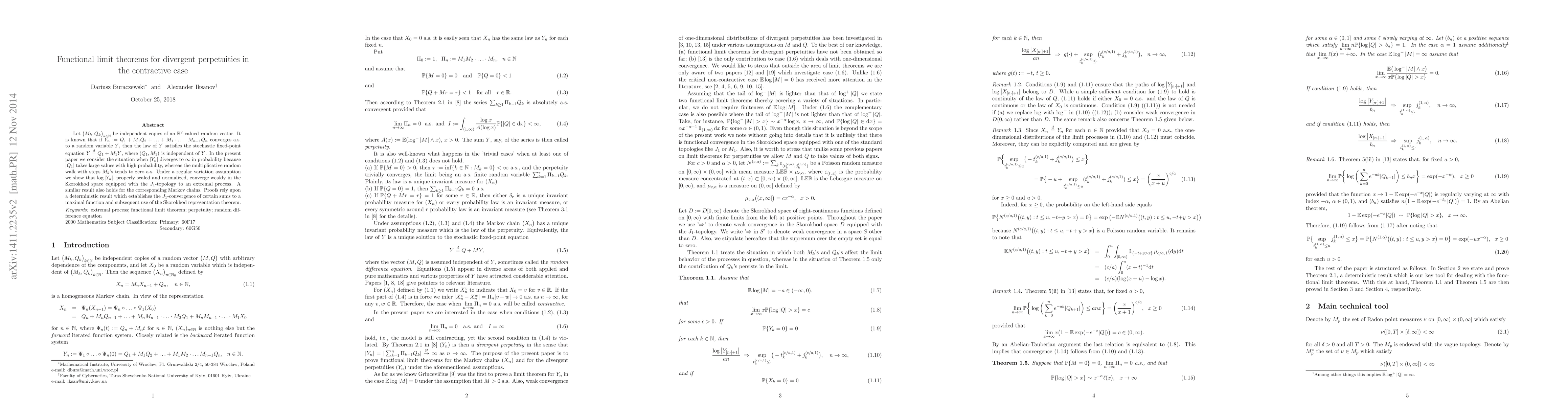 Let $\big(M_k, Q_k\big)_{k\in\mathbb{N}}$ be independent copies of an $\mathbb{R}^2$-valued random vector. It is known that if $Y_n:=Q_1+M_1Q_2+...+M_1\cdot...\cdot M_{n-1}Q_n$ converges a.s. to a random variable $Y$, then the law of $Y$ satisfies the stochastic fixed-point equation $Y \overset{d}{=} Q_1+M_1Y$, where $(Q_1, M_1)$ is independent of $Y$. In the present paper we consider the situation when $|Y_n|$ diverges to $\infty$ in probability because $|Q_1|$ takes large values with high probability, whereas the multiplicative random walk with steps $M_k$'s tends to zero a.s. Under a regular variation assumption we show that $\log |Y_n|$, properly scaled and normalized, converge weakly in the Skorokhod space equipped with the $J_1$-topology to an extremal process. A similar result also holds for the corresponding Markov chains. Proofs rely upon a deterministic result which establishes the $J_1$-convergence of certain sums to a maximal function and subsequent use of the Skorokhod representation theorem.