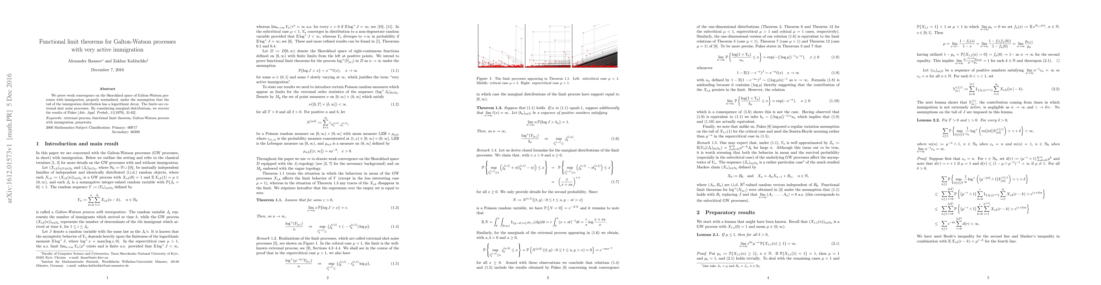 We prove weak convergence on the Skorokhod space of Galton-Watson processes with immigration, properly normalized, under the assumption that the tail of the immigration distribution has a logarithmic decay. The limits are extremal shot noise processes. By considering marginal distributions, we recover the results of Pakes [Adv. Appl. Probab., 11(1979), 31--62].