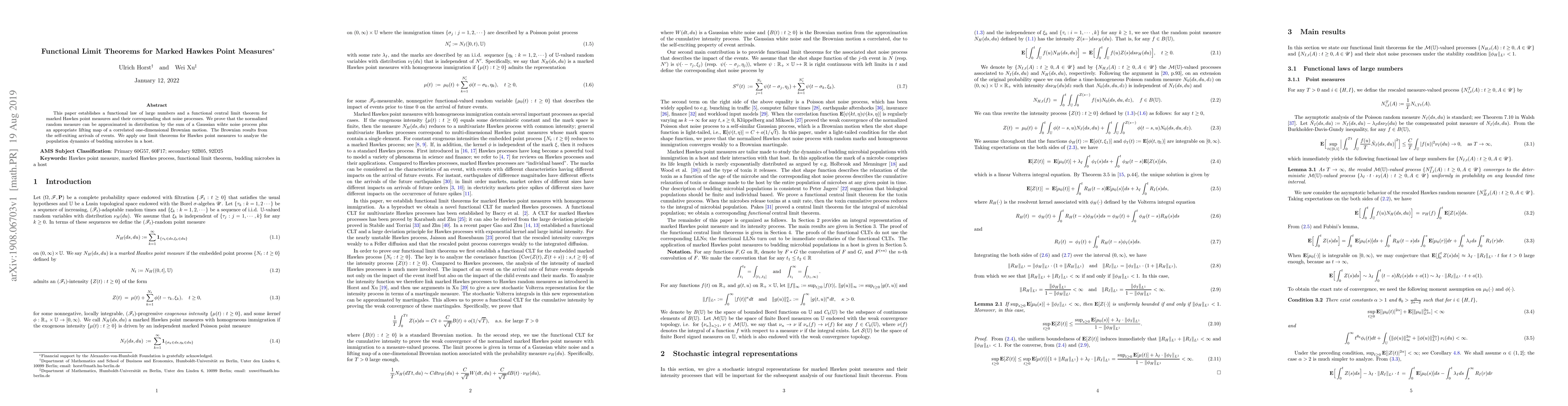 This paper proves functional limit theorems for marked Hawkes point measures, showing their normalized random measures converge to a Gaussian white noise plus a correlated Brownian motion. The findings are applied to analyze the population dynamics of budding microbes in a host.