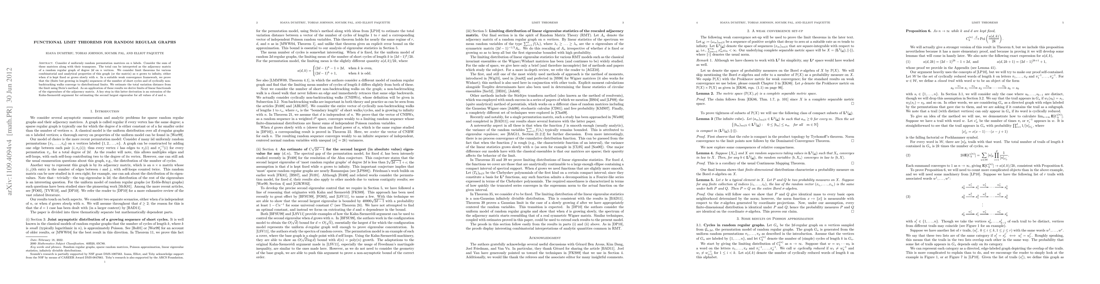 Consider d uniformly random permutation matrices on n labels. Consider the sum of these matrices along with their transposes. The total can be interpreted as the adjacency matrix of a random regular graph of degree 2d on n vertices. We consider limit theorems for various combinatorial and analytical properties of this graph (or the matrix) as n grows to infinity, either when d is kept fixed or grows slowly with n. In a suitable weak convergence framework, we prove that the (finite but growing in length) sequences of the number of short cycles and of cyclically non-backtracking walks converge to distributional limits. We estimate the total variation distance from the limit using Stein's method. As an application of these results we derive limits of linear functionals of the eigenvalues of the adjacency matrix. A key step in this latter derivation is an extension of the Kahn-Szemer\'edi argument for estimating the second largest eigenvalue for all values of d and n.