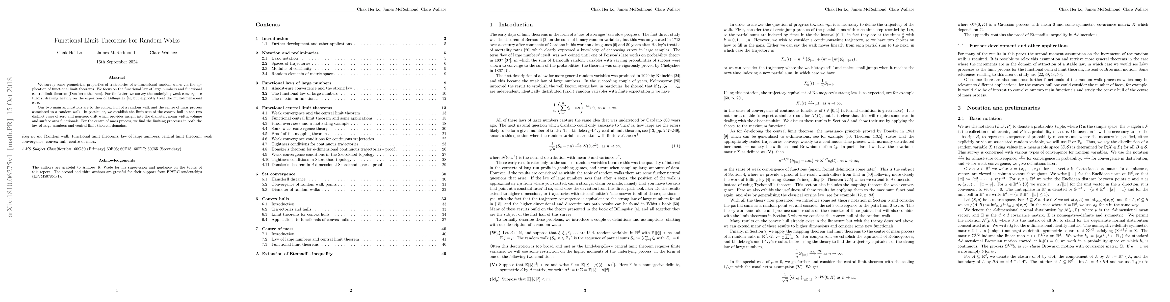 This paper surveys the geometrical properties of $d$-dimensional random walks using functional limit theorems, focusing on Donsker's theorem and its applications to the convex hull and centre of mass process. It establishes limit sets for the convex hull under zero and non-zero drift, and identifies limiting processes for the centre of mass.