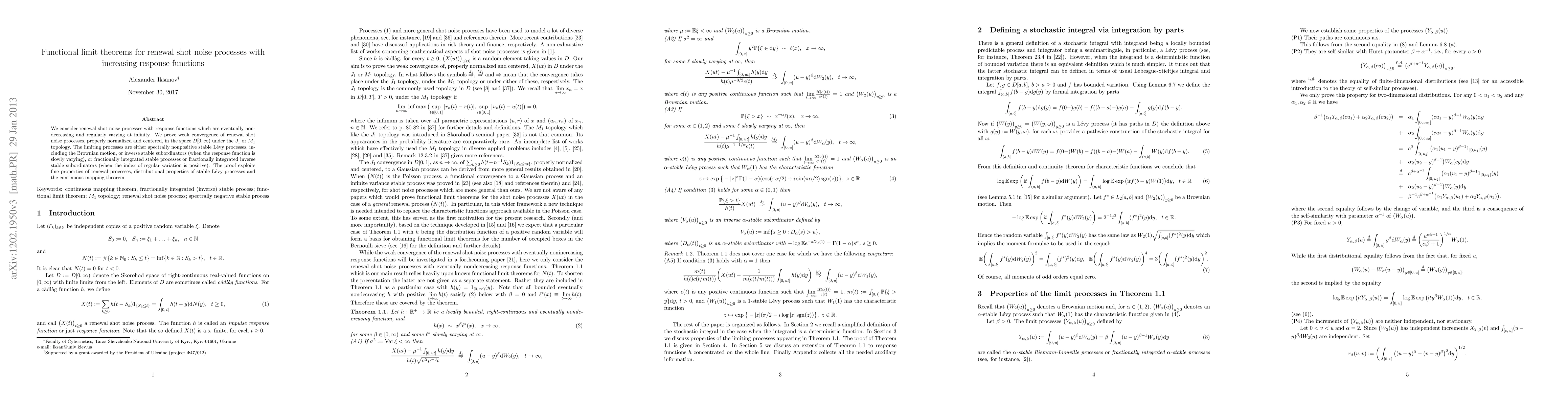 This paper proves the weak convergence of renewal shot noise processes with nondecreasing, regularly varying response functions to various limiting processes, including spectrally nonpositive stable Lévy processes, inverse stable subordinators, and fractionally integrated variants. The proof utilizes properties of renewal processes and stable Lévy processes.