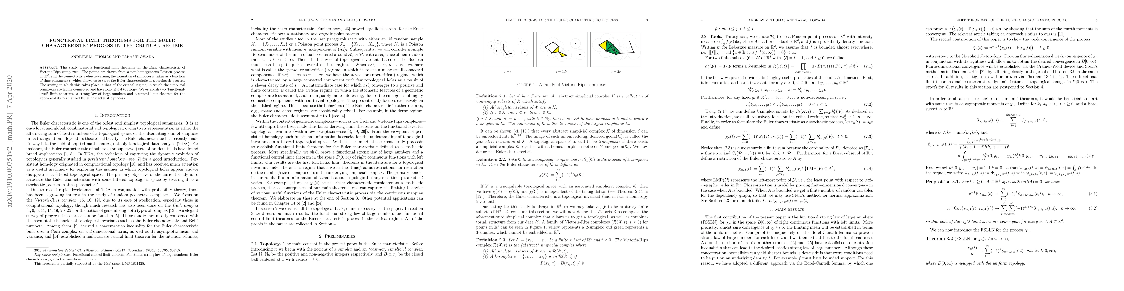 This paper establishes functional limit theorems for the Euler characteristic of Vietoris-Rips complexes formed from points in a non-homogeneous Poisson process, focusing on the critical regime where the complexes are highly connected. It proves a strong law of large numbers and a central limit theorem for the normalized Euler characteristic process.