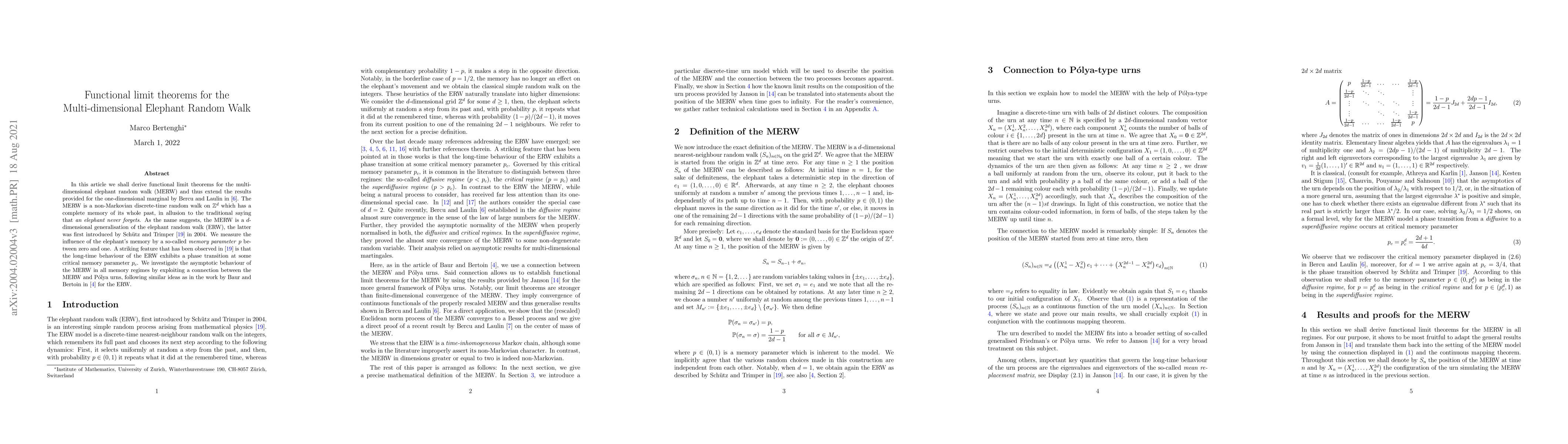 This paper derives functional limit theorems for the multi-dimensional elephant random walk (MERW), extending previous results for the one-dimensional case. It explores the MERW's long-time behavior across different memory regimes, revealing a phase transition influenced by a memory parameter, and connects it to Pólya urns.