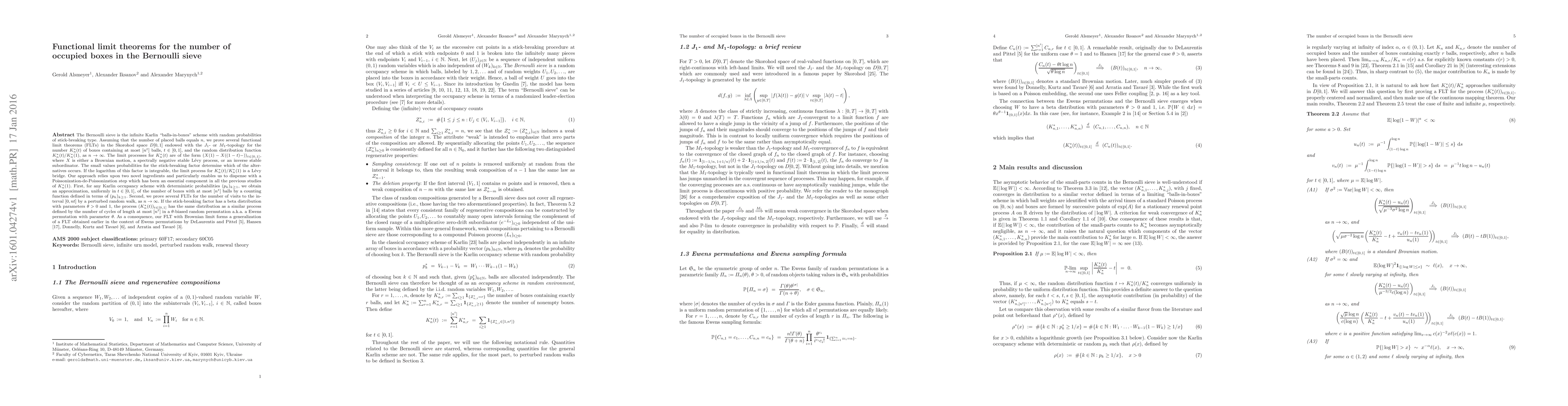 The Bernoulli sieve is the infinite Karlin "balls-in-boxes" scheme with random probabilities of stick-breaking type. Assuming that the number of placed balls equals $n$, we prove several functional limit theorems (FLTs) in the Skorohod space $D[0,1]$ endowed with the $J_{1}$- or $M_{1}$-topology for the number $K_{n}^{*}(t)$ of boxes containing at most $[n^{t}]$ balls, $t\in[0,1]$, and the random distribution function $K_{n}^{*}(t)/K_{n}^{*}(1)$, as $n\to\infty$. The limit processes for $K_{n}^{*}(t)$ are of the form $(X(1)-X((1-t)-))_{t\in[0,1]}$, where $X$ is either a Brownian motion, a spectrally negative stable L\'evy process, or an inverse stable subordinator. The small values probabilities for the stick-breaking factor determine which of the alternatives occurs. If the logarithm of this factor is integrable, the limit process for $K_{n}^{*}(t)/K_{n}^{*}(1)$ is a L\'evy bridge. Our approach relies upon two novel ingredients and particularly enables us to dispense with a Poissonization-de-Poissonization step which has been an essential component in all the previous studies of $K_{n}^{*}(1)$. First, for any Karlin occupancy scheme with deterministic probabilities $(p_{k})_{k\ge 1}$, we obtain an approximation, uniformly in $t\in[0,1]$, of the number of boxes with at most $[n^{t}]$ balls by a counting function defined in terms of $(p_{k})_{k\ge 1}$. Second, we prove several FLTs for the number of visits to the interval $[0,nt]$ by a perturbed random walk, as $n\to\infty$.