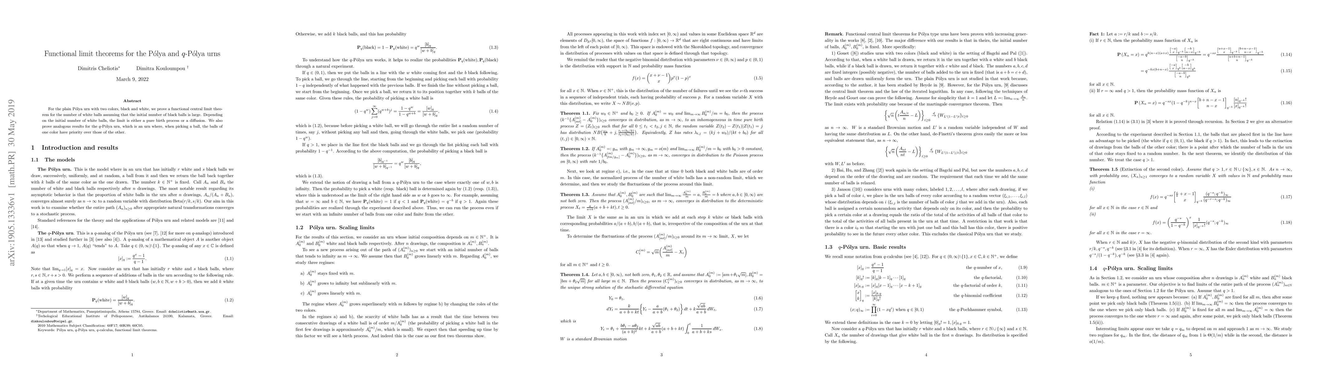 This paper proves functional central limit theorems for the Polya and q-Polya urns, showing that the number of white balls in the Polya urn converges to either a pure birth process or a diffusion, depending on the initial conditions. It also extends these results to the q-Polya urn, where balls of one color have priority over the other.