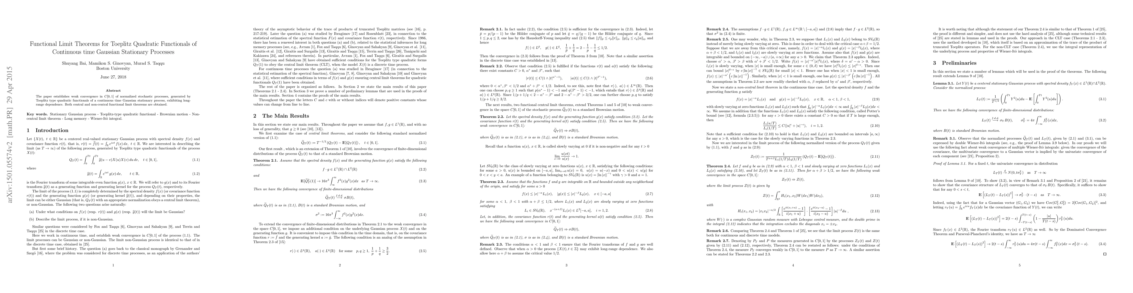 The paper proves weak convergence in $C[0,1]$ for normalized stochastic processes derived from Toeplitz quadratic functionals of continuous time Gaussian stationary processes with long-range dependence, establishing both central and non-central functional limit theorems.