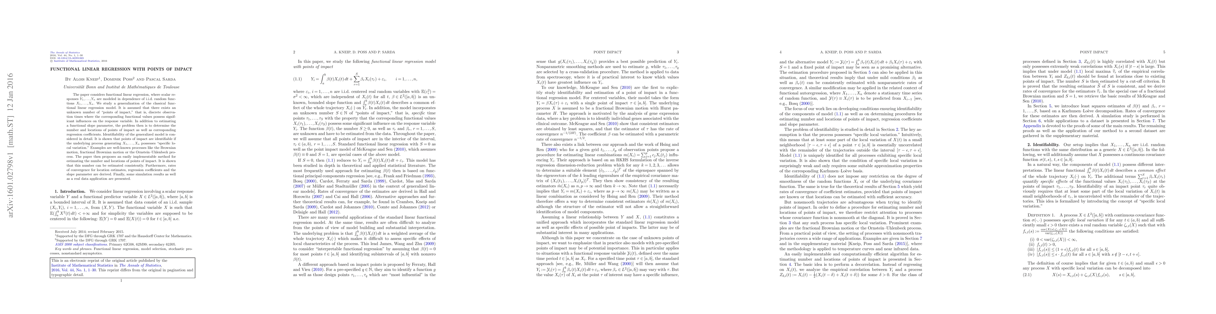 The paper considers functional linear regression, where scalar responses $Y_1,\ldots,Y_n$ are modeled in dependence of i.i.d. random functions $X_1,\ldots,X_n$. We study a generalization of the classical functional linear regression model. It is assumed that there exists an unknown number of "points of impact," that is, discrete observation times where the corresponding functional values possess significant influences on the response variable. In addition to estimating a functional slope parameter, the problem then is to determine the number and locations of points of impact as well as corresponding regression coefficients. Identifiability of the generalized model is considered in detail. It is shown that points of impact are identifiable if the underlying process generating $X_1,\ldots,X_n$ possesses "specific local variation." Examples are well-known processes like the Brownian motion, fractional Brownian motion or the Ornstein-Uhlenbeck process. The paper then proposes an easily implementable method for estimating the number and locations of points of impact. It is shown that this number can be estimated consistently. Furthermore, rates of convergence for location estimates, regression coefficients and the slope parameter are derived. Finally, some simulation results as well as a real data application are presented.