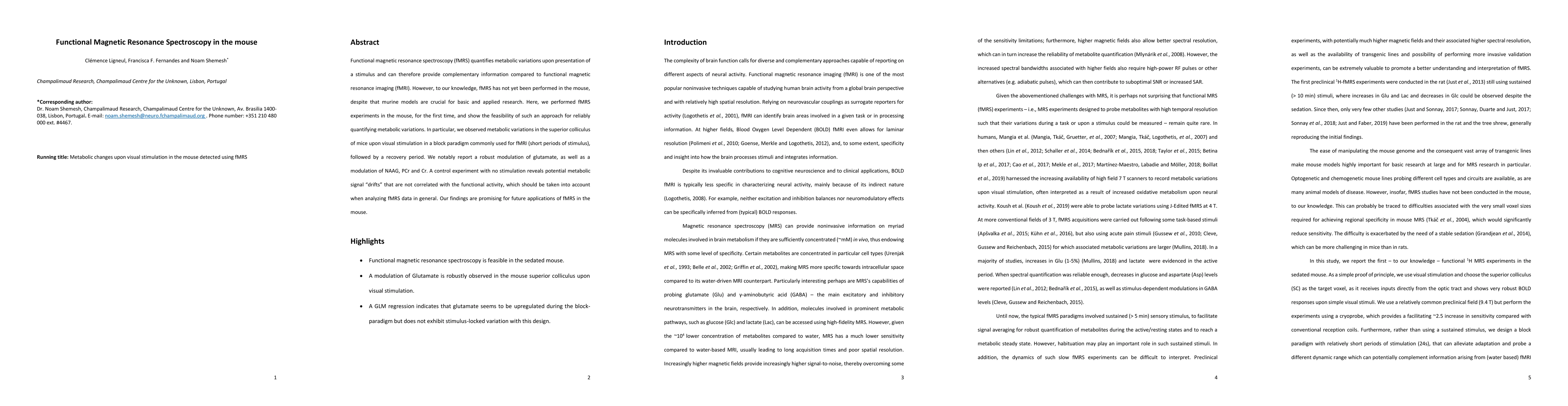 This study demonstrates the first successful application of functional magnetic resonance spectroscopy (fMRS) in mice, showing its feasibility in quantifying metabolic variations during visual stimulation. The results reveal significant modulations in metabolites like glutamate, NAAG, PCr, and Cr, highlighting the potential of fMRS for future research in murine models.