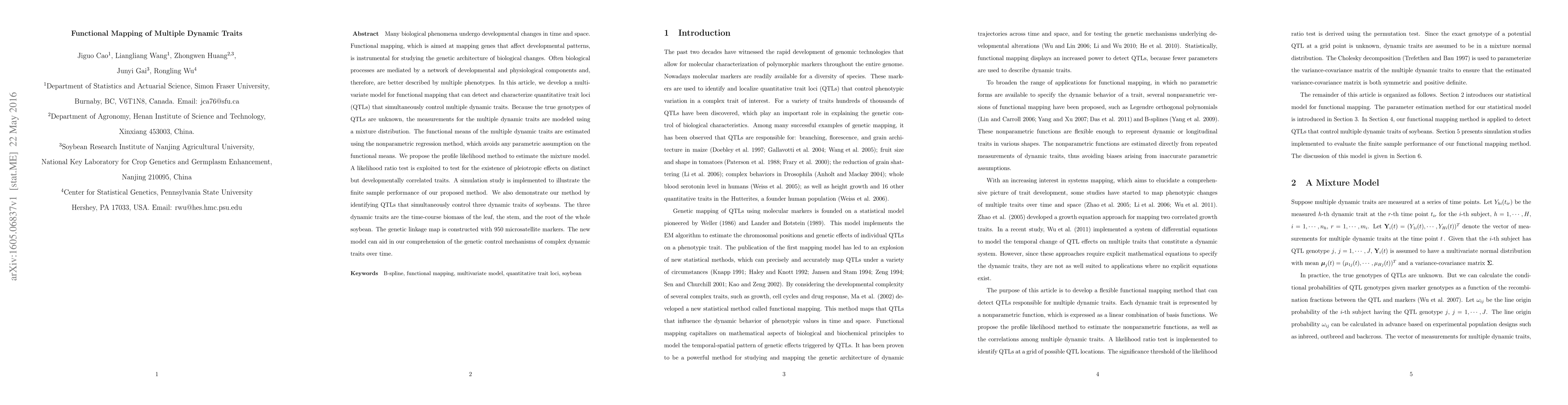 Many biological phenomena undergo developmental changes in time and space. Functional mapping, which is aimed at mapping genes that affect developmental patterns, is instrumental for studying the genetic architecture of biological changes. Often biological processes are mediated by a network of developmental and physiological components and, therefore, are better described by multiple phenotypes. In this article, we develop a multivariate model for functional mapping that can detect and characterize quantitative trait loci (QTLs) that simultaneously control multiple dynamic traits. Because the true genotypes of QTLs are unknown, the measurements for the multiple dynamic traits are modeled using a mixture distribution. The functional means of the multiple dynamic traits are estimated using the nonparametric regression method, which avoids any parametric assumption on the functional means. We propose the profile likelihood method to estimate the mixture model. A likelihood ratio test is exploited to test for the existence of pleiotropic effects on distinct but developmentally correlated traits. A simulation study is implemented to illustrate the finite sample performance of our proposed method. We also demonstrate our method by identifying QTLs that simultaneously control three dynamic traits of soybeans. The three dynamic traits are the time-course biomass of the leaf, the stem, and the root of the whole soybean. The genetic linkage map is constructed with 950 microsatellite markers. The new model can aid in our comprehension of the genetic control mechanisms of complex dynamic traits over time.
