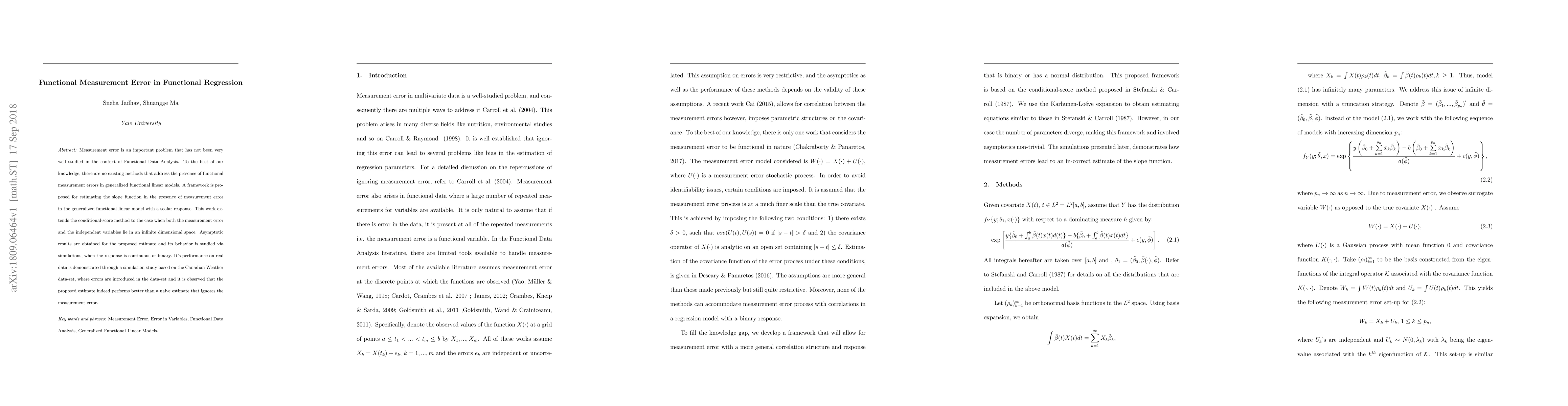 This paper proposes a new framework for estimating the slope function in generalized functional linear models when measurement errors are present. The method extends the conditional-score approach to handle infinite dimensional spaces and is shown to outperform naive estimates through simulations and real data analysis using the Canadian Weather dataset.