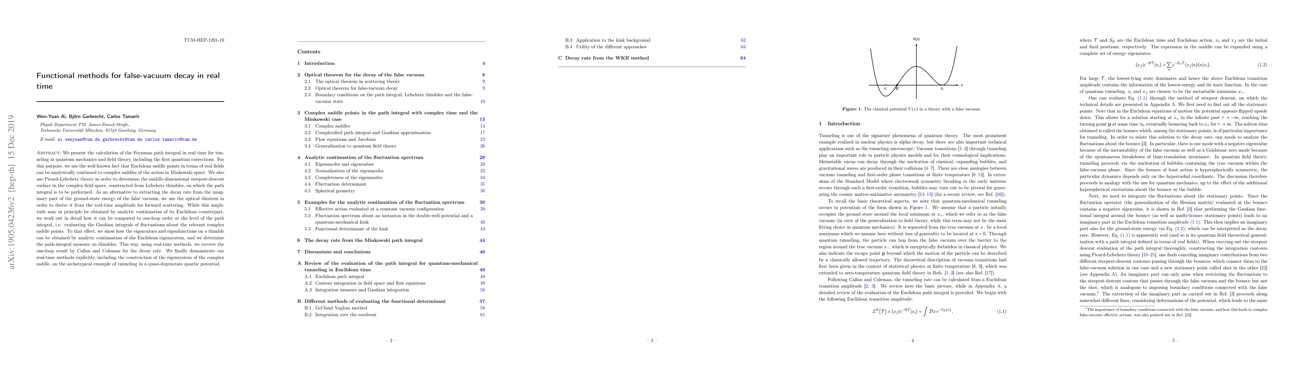 We present the calculation of the Feynman path integral in real time for tunneling in quantum mechanics and field theory, including the first quantum corrections. For this purpose, we use the well-known fact that Euclidean saddle points in terms of real fields can be analytically continued to complex saddles of the action in Minkowski space. We also use Picard-Lefschetz theory in order to determine the middle-dimensional steepest-descent surface in the complex field space, constructed from Lefschetz thimbles, on which the path integral is to be performed. As an alternative to extracting the decay rate from the imaginary part of the ground-state energy of the false vacuum, we use the optical theorem in order to derive it from the real-time amplitude for forward scattering. While this amplitude may in principle be obtained by analytic continuation of its Euclidean counterpart, we work out in detail how it can be computed to one-loop order at the level of the path integral, i.e. evaluating the Gau{\ss}ian integrals of fluctuations about the relevant complex saddle points. To that effect, we show how the eigenvalues and eigenfunctions on a thimble can be obtained by analytic continuation of the Euclidean eigensystem, and we determine the path-integral measure on thimbles. This way, using real-time methods, we recover the one-loop result by Callan and Coleman for the decay rate. We finally demonstrate our real-time methods explicitly, including the construction of the eigensystem of the complex saddle, on the archetypical example of tunneling in a quasi-degenerate quartic potential.