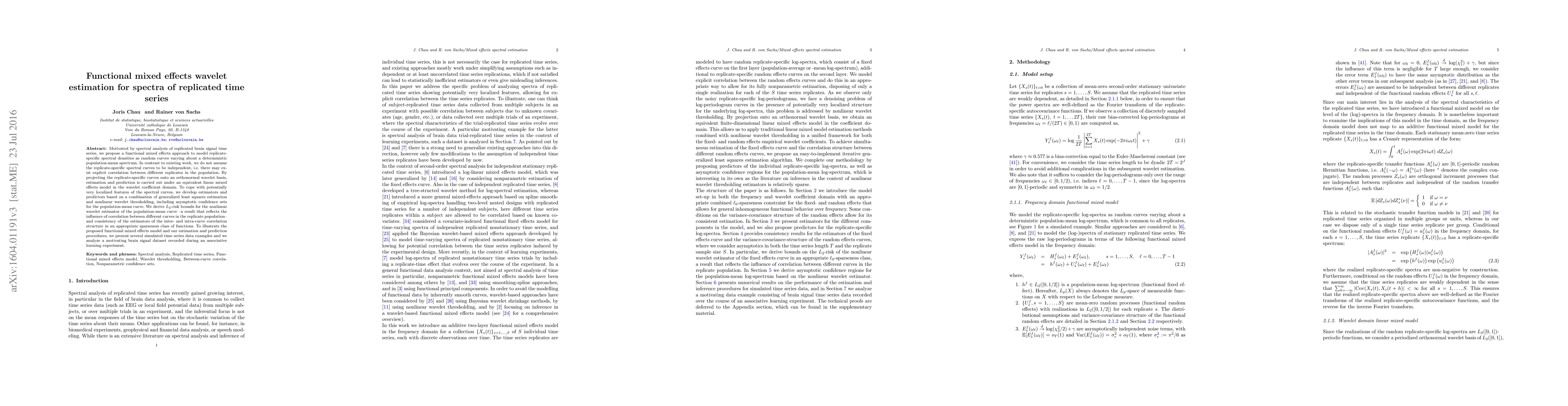 This paper proposes a functional mixed effects wavelet approach for modeling replicate-specific spectral densities of brain signal time series, allowing for correlation between replicates. It uses wavelet basis projections and combines generalized least squares and nonlinear wavelet thresholding for estimation and prediction, providing risk bounds and consistency results for the proposed estimators.