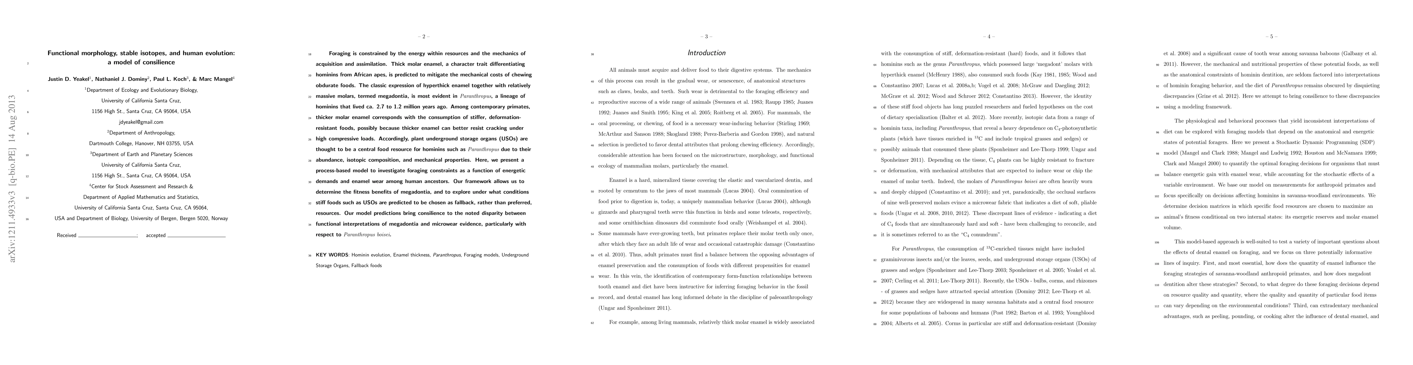 Foraging is constrained by the energy within resources and the mechanics of acquisition and assimilation. Thick molar enamel, a character trait differentiating hominins from African apes, is predicted to mitigate the mechanical costs of chewing obdurate foods. The classic expression of hyperthick enamel together with relatively massive molars, termed megadontia, is most evident in {\it Paranthropus}, a lineage of hominins that lived ca. 2.7 to 1.2 million years ago. Among contemporary primates, thicker molar enamel corresponds with the consumption of stiffer, deformation-resistant foods, possibly because thicker enamel can better resist cracking under high compressive loads. Accordingly, plant underground storage organs (USOs) are thought to be a central food resource for hominins such as {\it Paranthropus} due to their abundance, isotopic composition, and mechanical properties. Here, we present a process-based model to investigate foraging constraints as a function of energetic demands and enamel wear among human ancestors. Our framework allows us to determine the fitness benefits of megadontia, and to explore under what conditions stiff foods such as USOs are predicted to be chosen as fallback, rather than preferred, resources. Our model predictions bring consilience to the noted disparity between functional interpretations of megadontia and microwear evidence, particularly with respect to {\it Paranthropus boisei}.