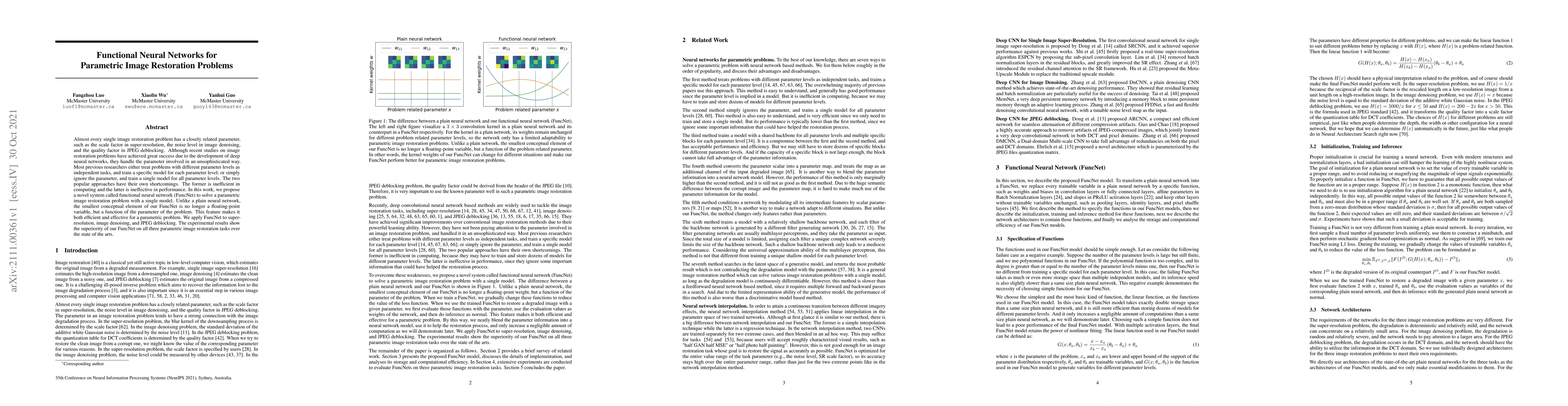Almost every single image restoration problem has a closely related parameter, such as the scale factor in super-resolution, the noise level in image denoising, and the quality factor in JPEG deblocking. Although recent studies on image restoration problems have achieved great success due to the development of deep neural networks, they handle the parameter involved in an unsophisticated way. Most previous researchers either treat problems with different parameter levels as independent tasks, and train a specific model for each parameter level; or simply ignore the parameter, and train a single model for all parameter levels. The two popular approaches have their own shortcomings. The former is inefficient in computing and the latter is ineffective in performance. In this work, we propose a novel system called functional neural network (FuncNet) to solve a parametric image restoration problem with a single model. Unlike a plain neural network, the smallest conceptual element of our FuncNet is no longer a floating-point variable, but a function of the parameter of the problem. This feature makes it both efficient and effective for a parametric problem. We apply FuncNet to super-resolution, image denoising, and JPEG deblocking. The experimental results show the superiority of our FuncNet on all three parametric image restoration tasks over the state of the arts.