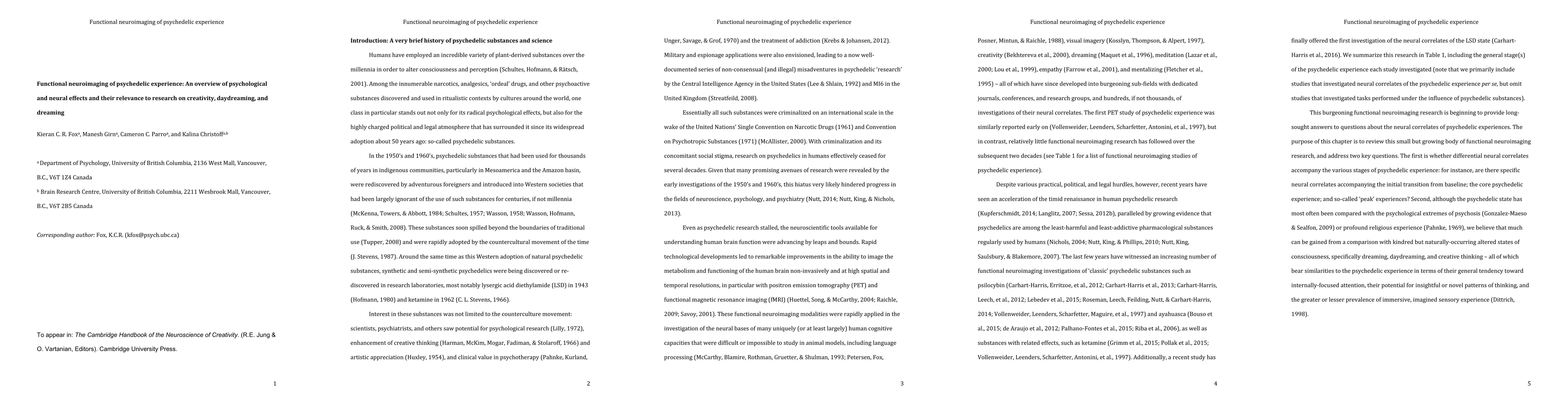 Humans have employed an incredible variety of plant-derived substances over the millennia in order to alter consciousness and perception. Among the innumerable narcotics, analgesics, 'ordeal' drugs, and other psychoactive substances discovered and used in ritualistic contexts by cultures around the world, one class in particular stands out not only for its radical psychological effects, but also for the highly charged political and legal atmosphere that has surrounded it since its widespread adoption about 50 years ago: so-called psychedelic substances. We review functional neuroimaging investigations of the neural correlates of the psychedelic experience, and highlight relationships with the psychological and neural bases of creativity, daydreaming, and dreaming.