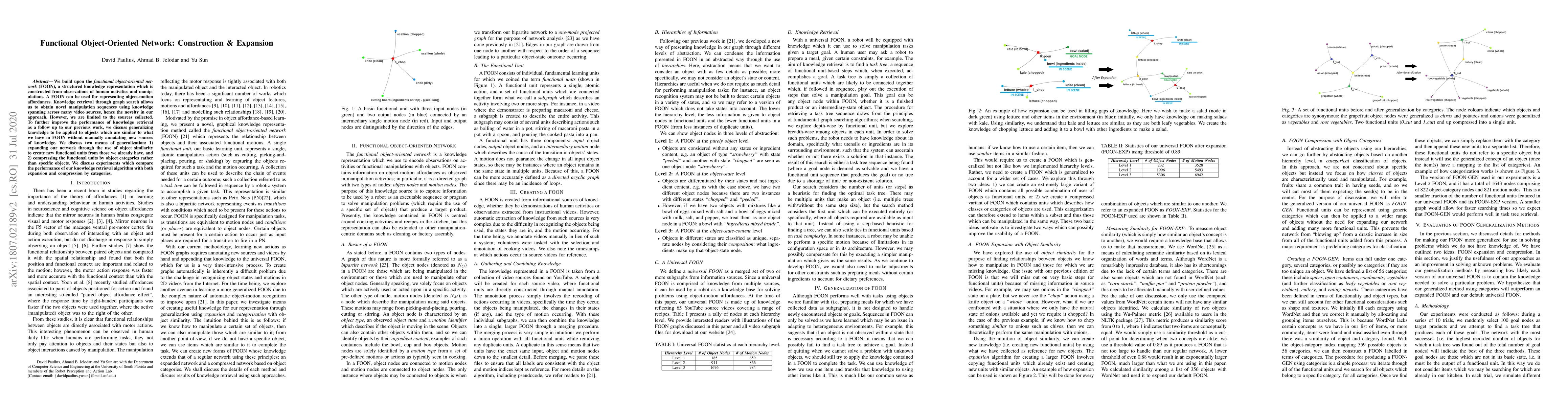 This paper introduces the functional object-oriented network (FOON) for representing object-motion affordances derived from human activities. It explores methods for generalizing FOON knowledge to similar objects without new annotations, including network expansion via object similarity and functional unit compression by categories, and evaluates their performance.