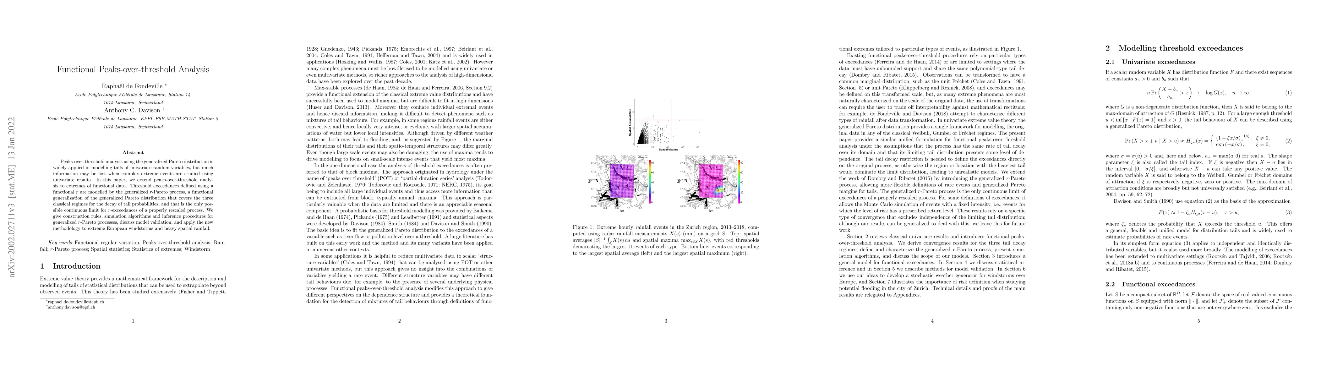 The paper presents the generalized r-Pareto process for functional data, along with construction rules, simulation algorithms, and inference procedures, extending peaks-over-threshold analysis to this domain.