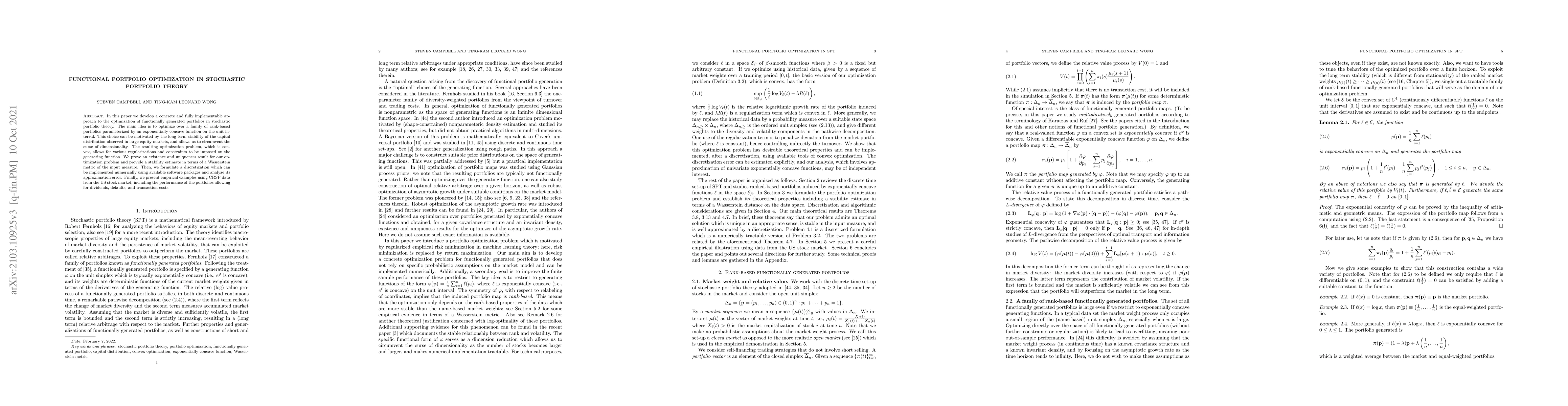 This paper proposes a method for optimizing functionally generated portfolios in stochastic portfolio theory, optimizing over rank-based portfolios parameterized by an exponentially concave function. The approach ensures long-term stability and circumvents the curse of dimensionality, providing a convex optimization problem with regularizations and constraints. Empirical examples using CRSP data demonstrate its practical application.