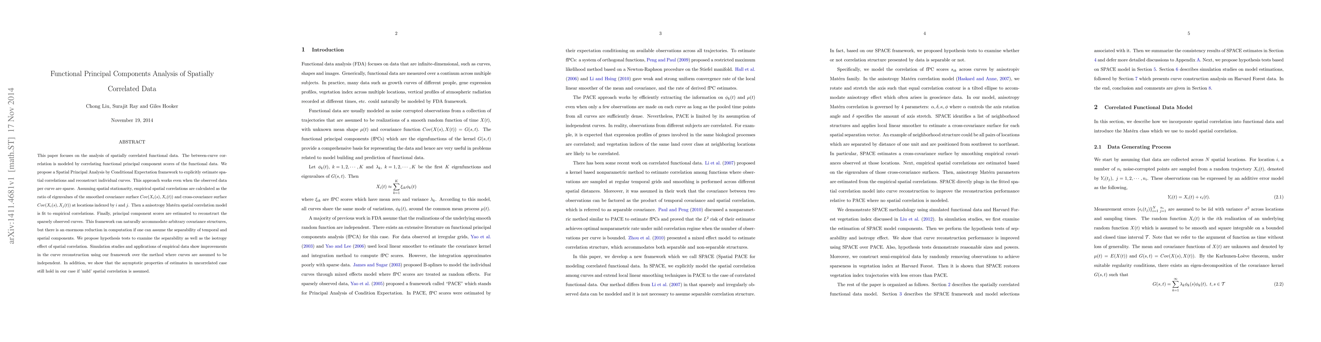 This paper proposes a Spatial Principal Analysis by Conditional Expectation framework to model and reconstruct spatially correlated functional data, demonstrating improved reconstruction over independent curve assumptions. The method accommodates arbitrary covariance structures and includes tests for separability and isotropy.