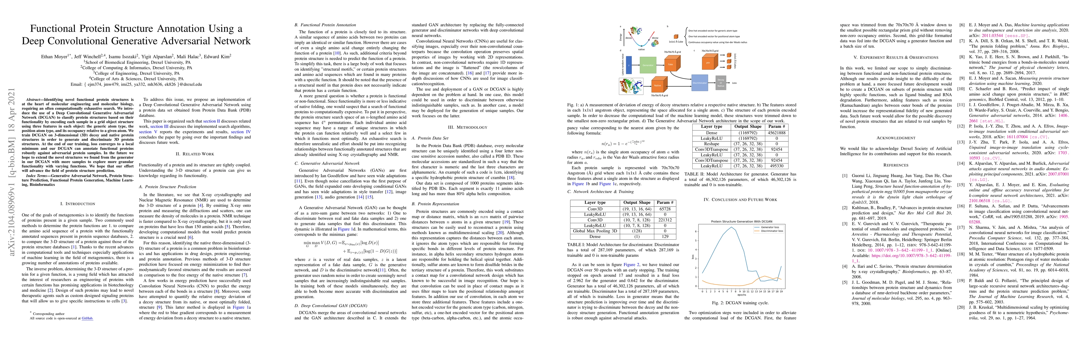 This paper introduces a Deep Convolutional Generative Adversarial Network (DCGAN) to classify protein structures based on functionality. The DCGAN encodes proteins using atom type, position, and occupancy, and trains on 3D decoy and native structures to robustly annotate functional proteins, with future plans to explore more granular functionalities.