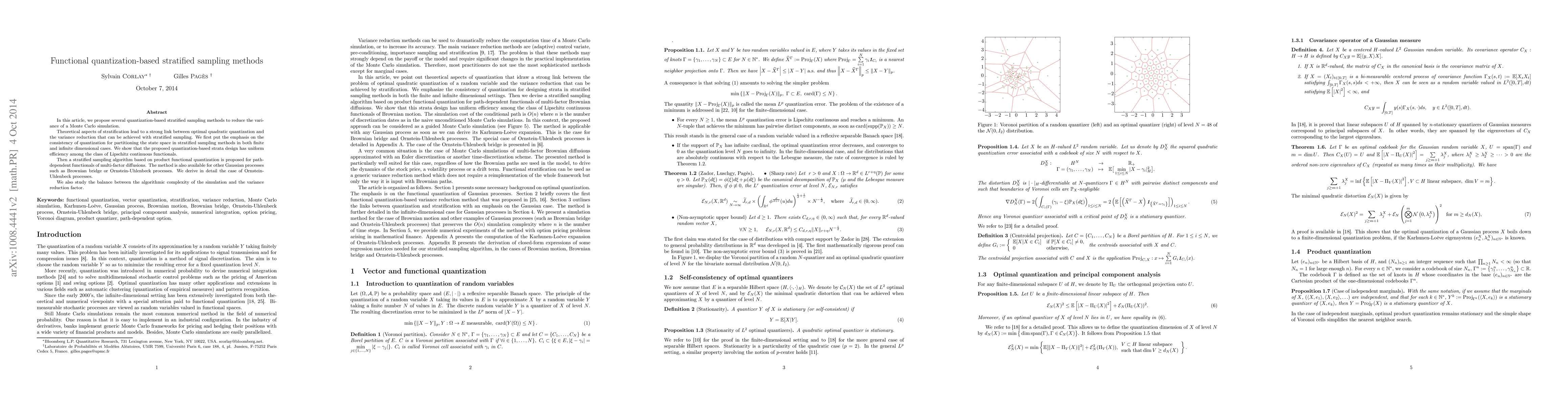 This paper introduces quantization-based stratified sampling methods to reduce Monte Carlo simulation variance, linking optimal quantization to variance reduction. It proposes efficient strata designs for both finite and infinite dimensions, and presents a stratified sampling algorithm for path-dependent functionals of multi-factor diffusions, including detailed analysis for Ornstein-Uhlenbeck processes.