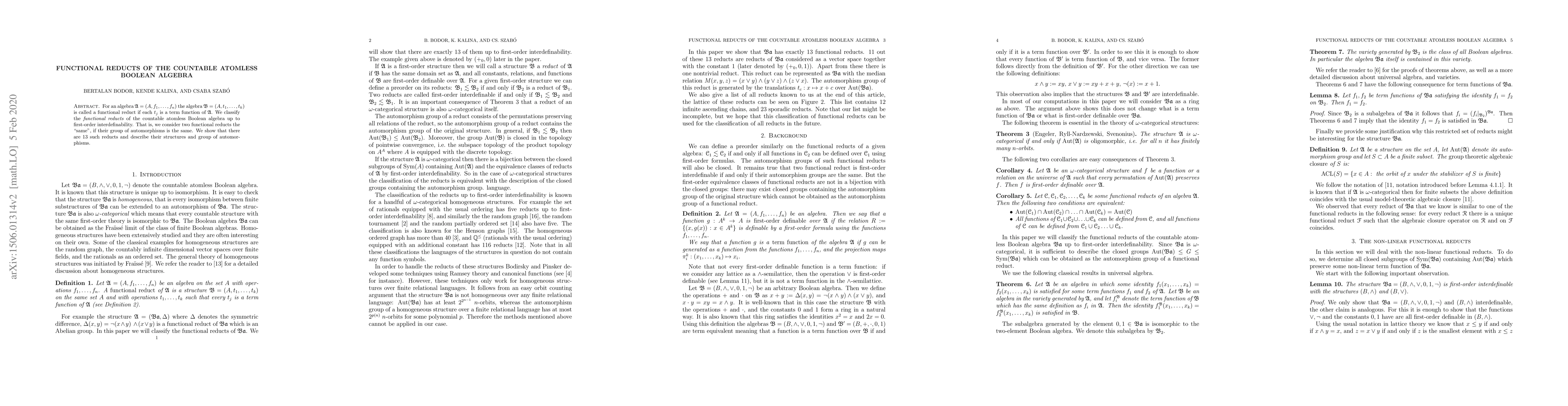 This paper classifies functional reducts of the countable atomless Boolean algebra, identifying exactly $13$ distinct structures up to first-order interdefinability. The study focuses on the special reducts of Boolean algebras.