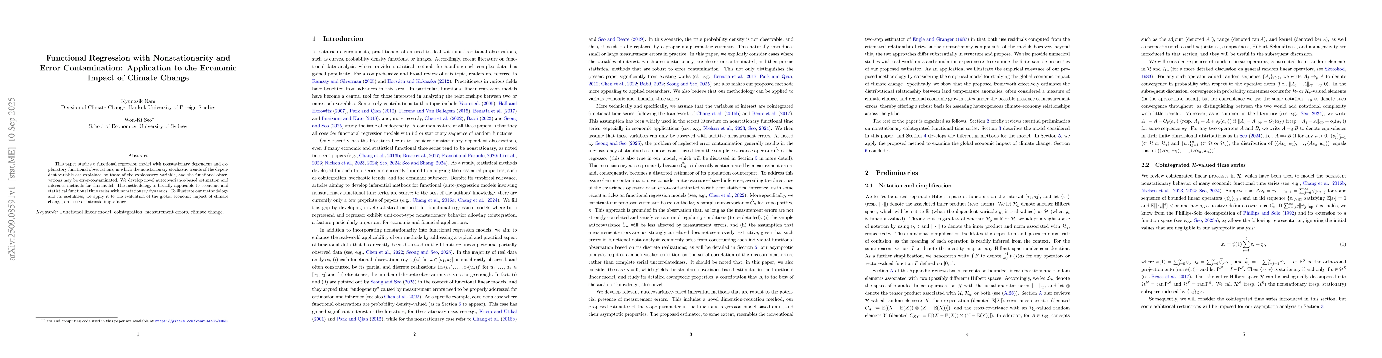 This paper studies a functional regression model with nonstationary dependent and explanatory functional observations, in which the nonstationary stochastic trends of the dependent variable are explained by those of the explanatory variable, and the functional observations may be error-contaminated. We develop novel autocovariance-based estimation and inference methods for this model. The methodology is broadly applicable to economic and statistical functional time series with nonstationary dynamics. To illustrate our methodology and its usefulness, we apply it to the evaluation of the global economic impact of climate change, an issue of intrinsic importance.