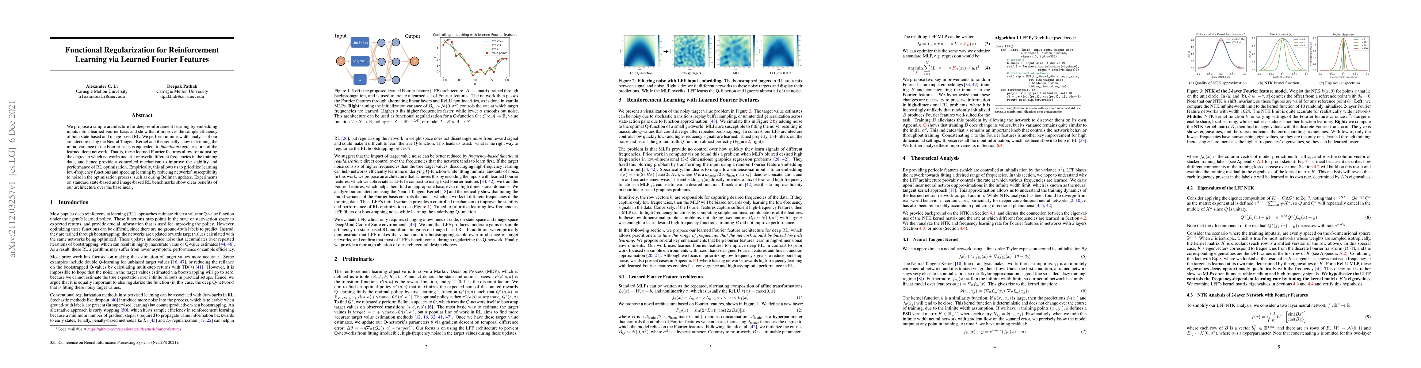 This paper proposes a reinforcement learning architecture that embeds inputs into a learned Fourier basis, enhancing sample efficiency. Theoretical analysis using the Neural Tangent Kernel shows that adjusting the initial variance of the Fourier basis acts as functional regularization, improving RL stability and performance by reducing susceptibility to noise.