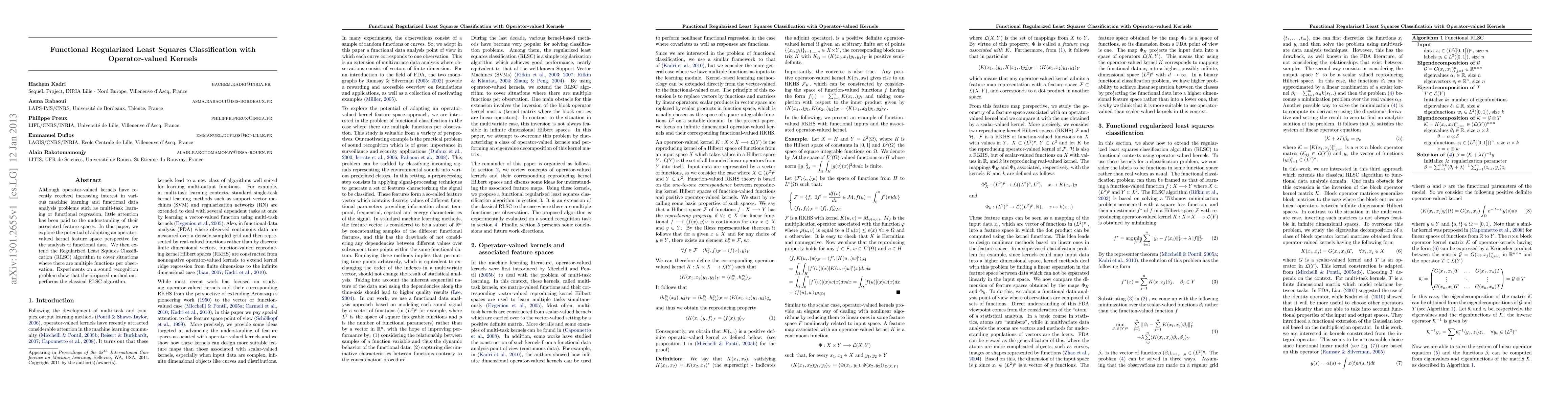 This paper investigates the application of operator-valued kernel feature spaces for functional data analysis, extending the Regularized Least Squares Classification (RLSC) algorithm to handle multiple functions per observation. Experimental results on a sound recognition task demonstrate superior performance compared to the classical RLSC method.